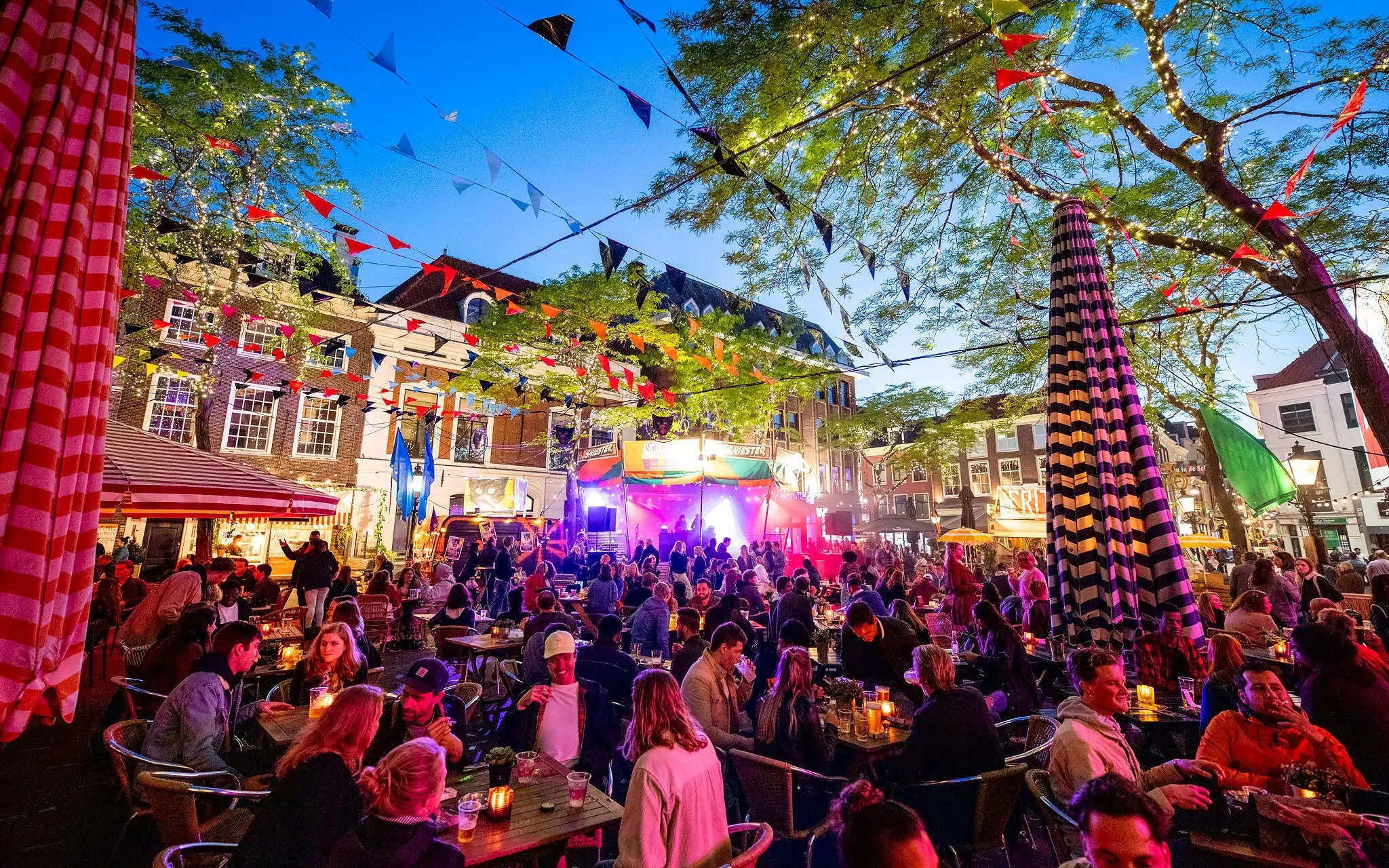 Outdoor concert or festival with many people sitting at tables, festive decorations, and a stage with bright colorful lights in a town square during the evening.