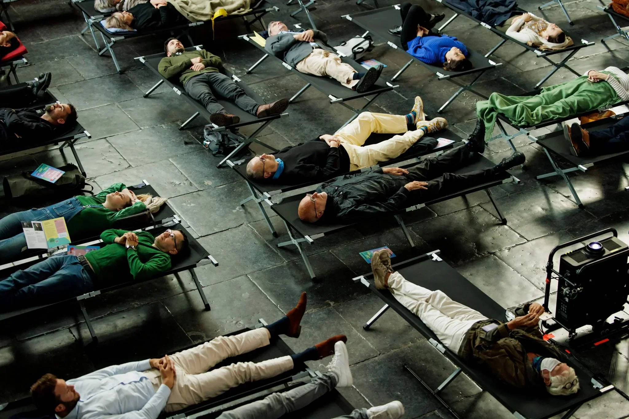 People lying on cots in an indoor space, possibly participating in a sleep study or resting during an event.