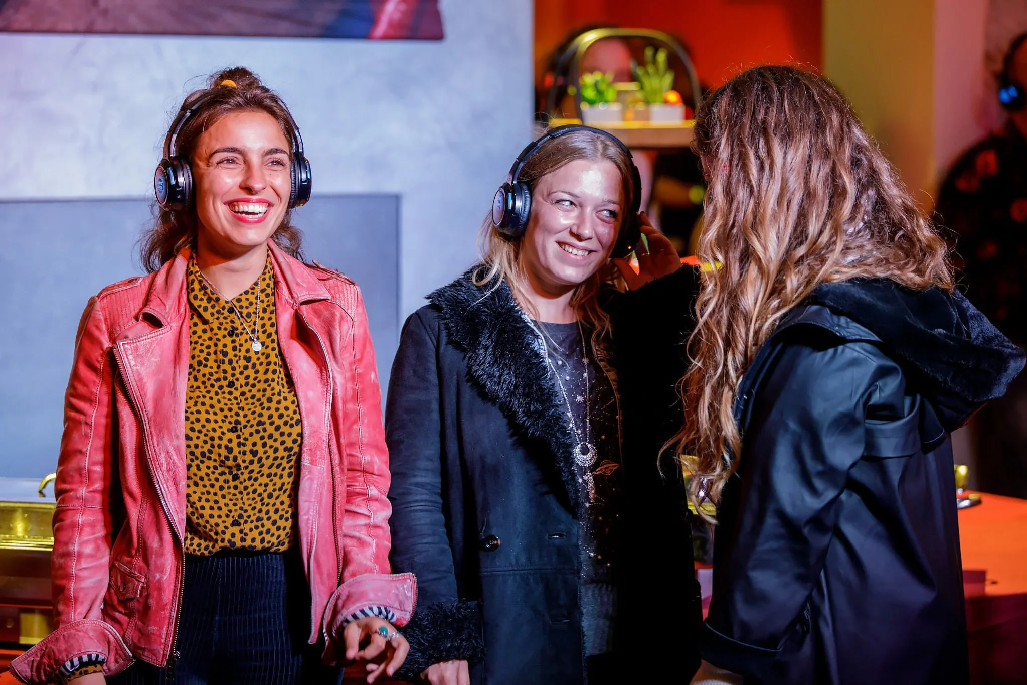 Three women enjoying themselves while wearing headphones in a lively indoor setting, possibly a social event or party.