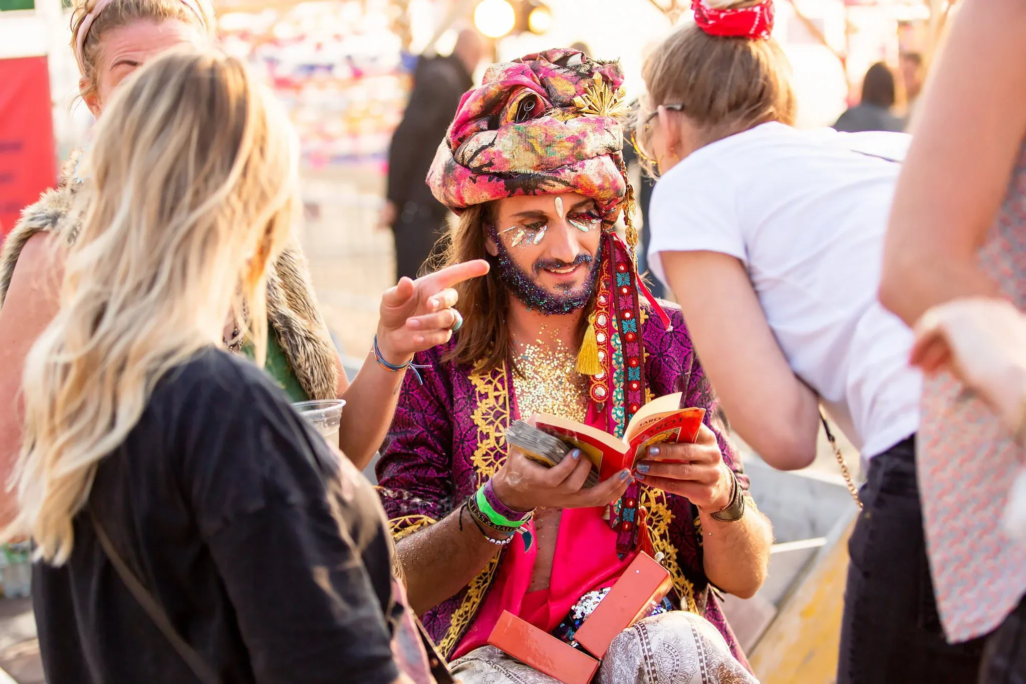 Person dressed in colorful, glitter decorated clothing and headscarf reading tarot cards at an outdoor event.