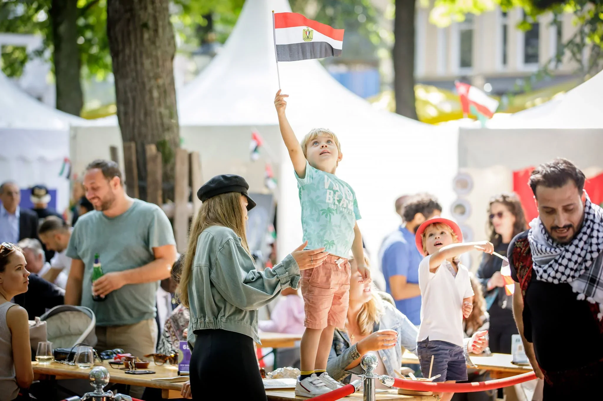 Children and adults at an outdoor festival or fair with white tents, trees, and flags. A young boy stands on a table, holding a flag, looking up. Other children and adults are nearby, some talking and others watching the activities.