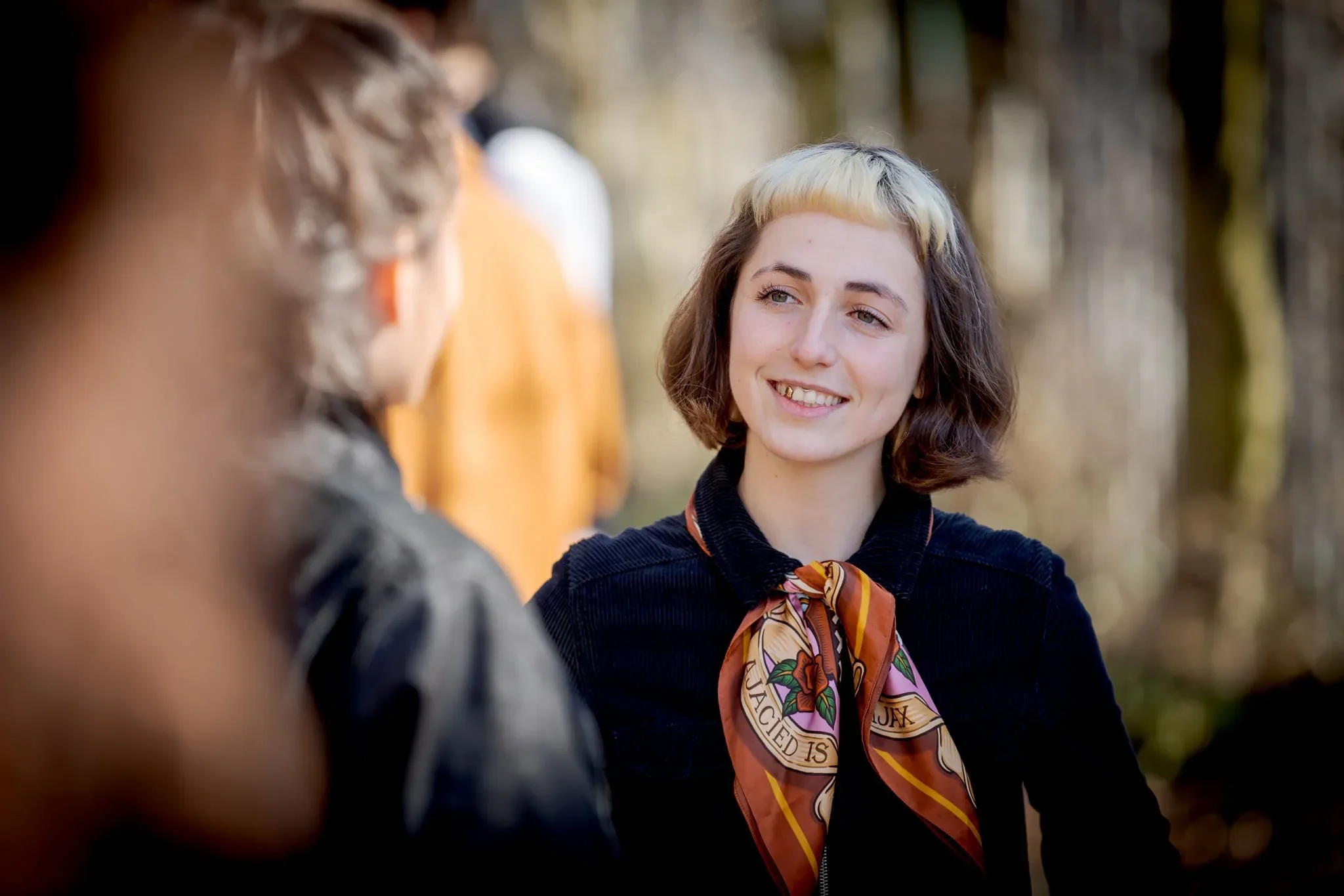 A young woman with dark brown hair and a blonde streak, wearing a black jacket and an orange-patterned scarf, smiling at someone in an outdoor setting with trees in the background.