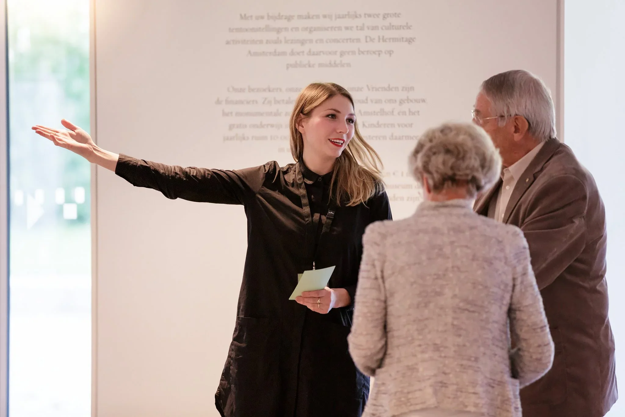 A woman is speaking and gesturing with her right arm while talking to an elderly couple indoors. The woman has long, light brown hair, and is dressed in a black outfit. The elderly man has gray hair, glasses, and is wearing a brown blazer. The elderl