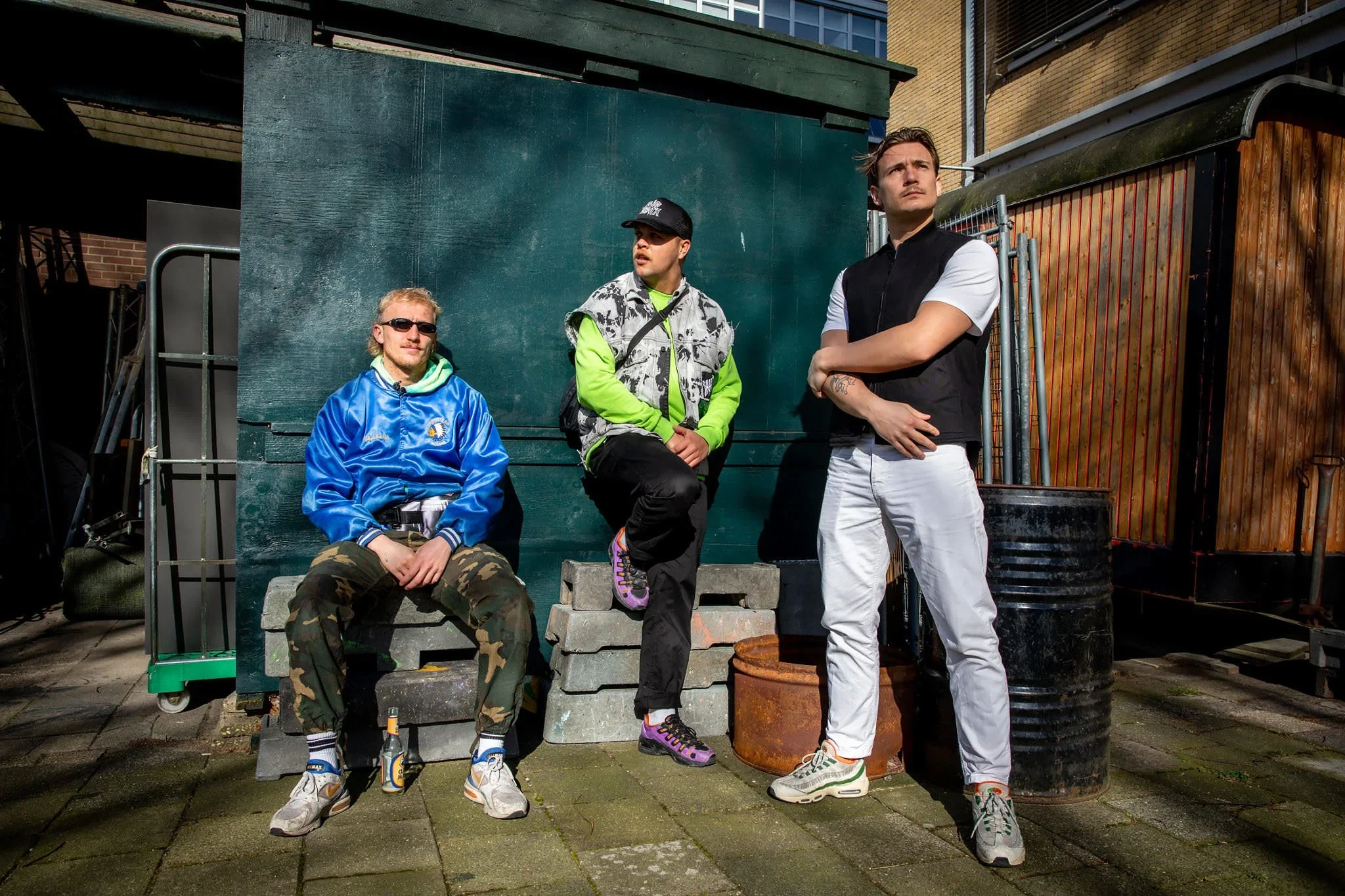 Three young men in casual streetwear pose outdoors against a concrete wall and urban background. One seated on a stack of concrete blocks wearing camo pants, a blue satin jacket, sunglasses, with a bottle on the ground near his feet. The second stand
