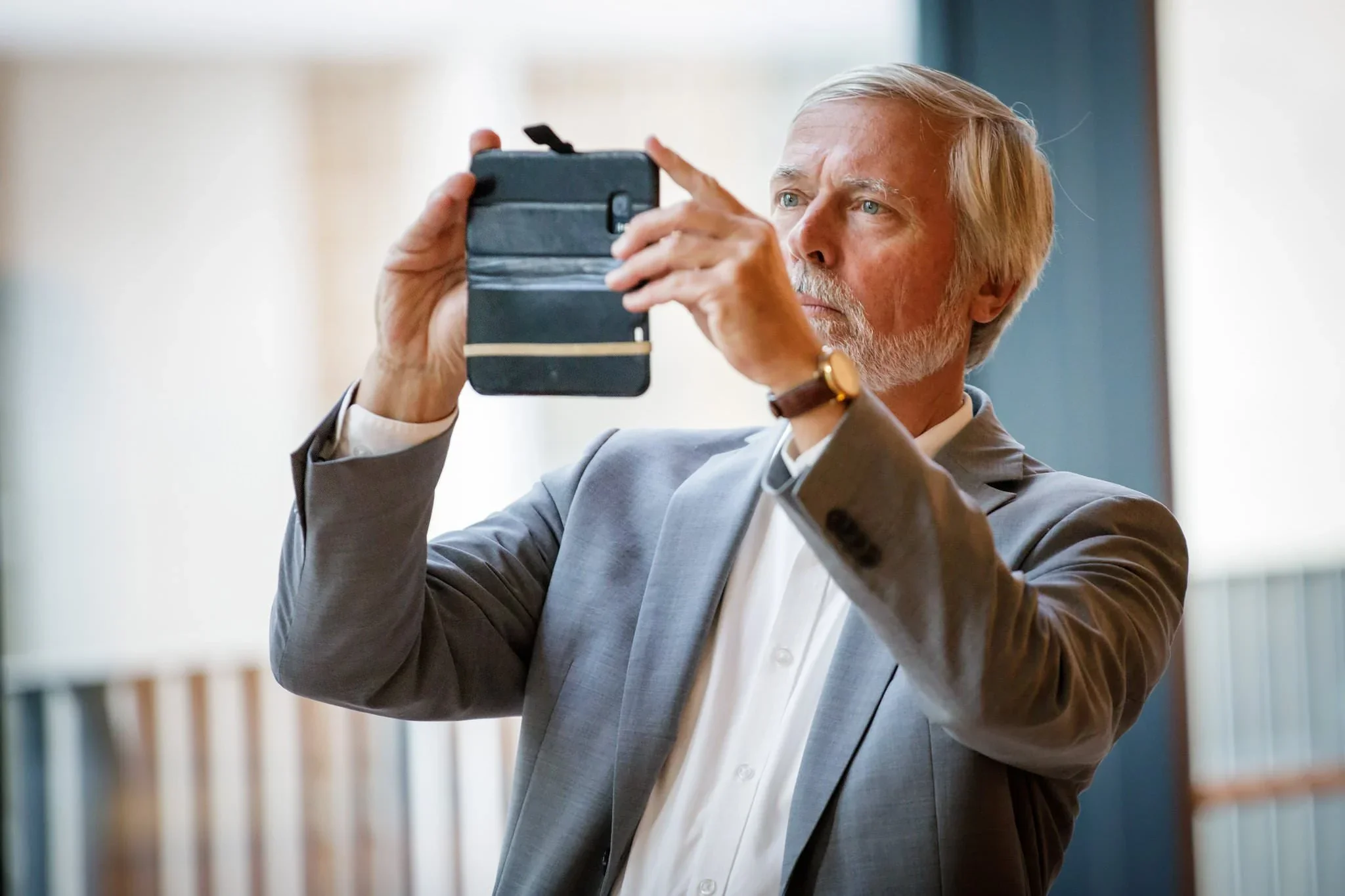 An older man with gray hair and beard wearing a gray suit and white shirt, taking a photo with a smartphone.