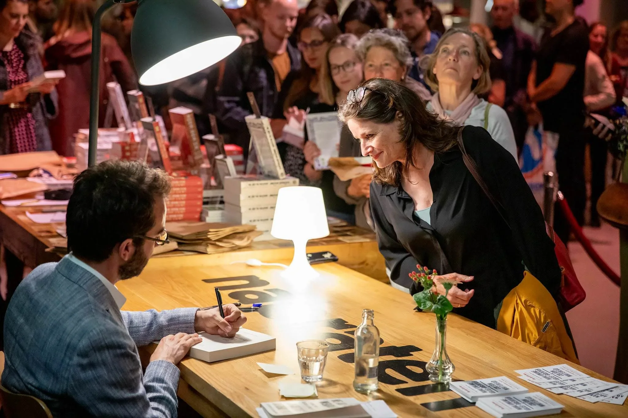 A woman in black coat is leaning over a table, talking to a man in glasses who is signing a book. The table has a small lamp, a plant, a water bottle, and some papers. In the background, there is a crowd of people at a book signing event.