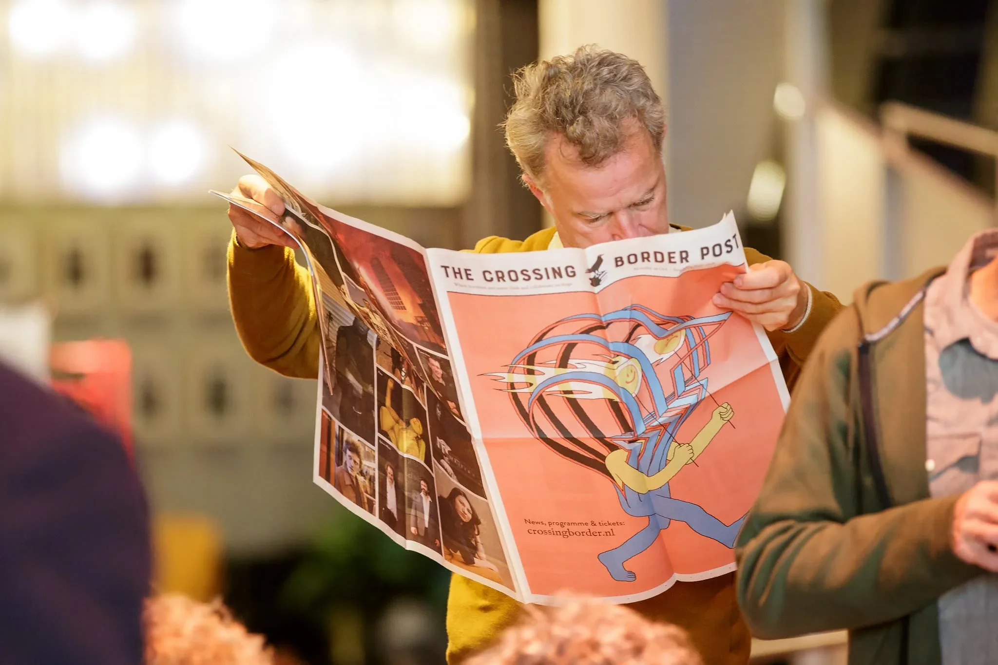 A man with short, curly hair wearing a mustard yellow sweater holding a colorful brochure with cartoon artwork and text for a crossing border event.
