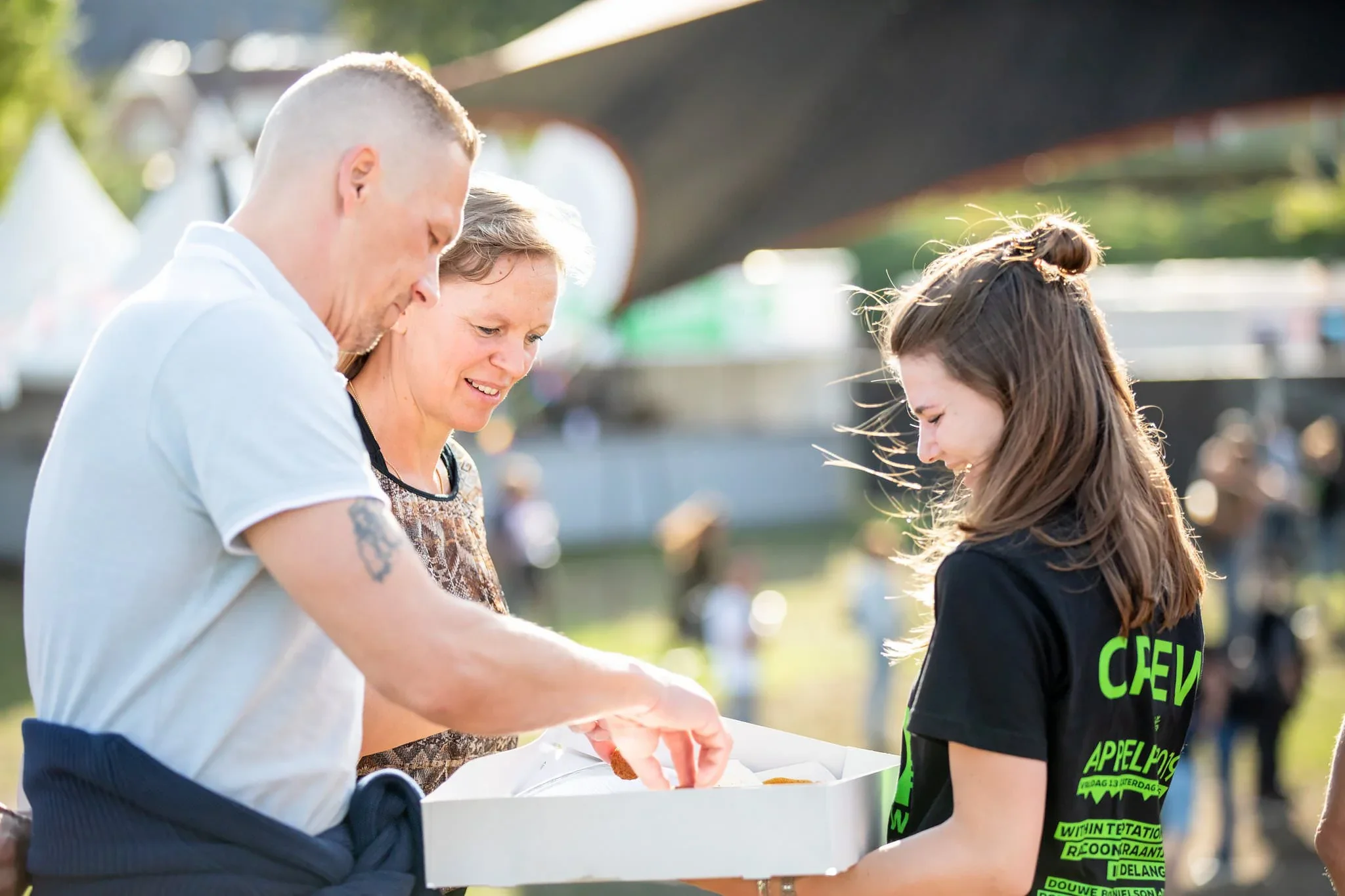 A man, woman, and young woman looking into a box at an outdoor event, smiling. The young woman is wearing a black t-shirt with green text. The woman has short gray hair, and the man has a tattoo on his left arm. Sunlight is shining, and there are blu