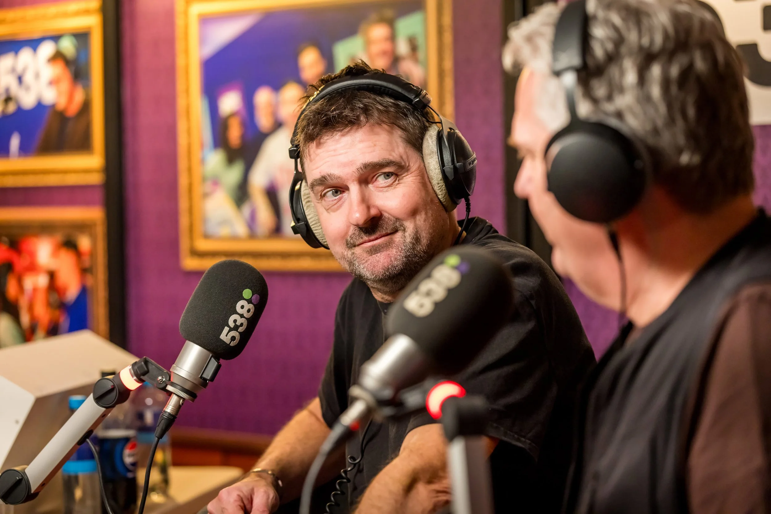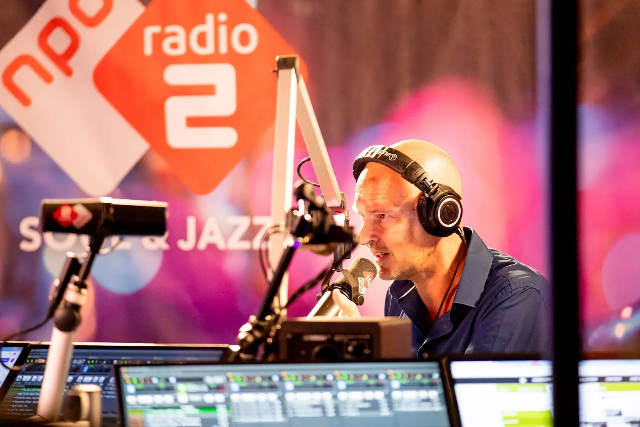 A radio host wearing headphones speaking into a microphone at a broadcasting station with a 'radio 2' sign and a purple decorated background.