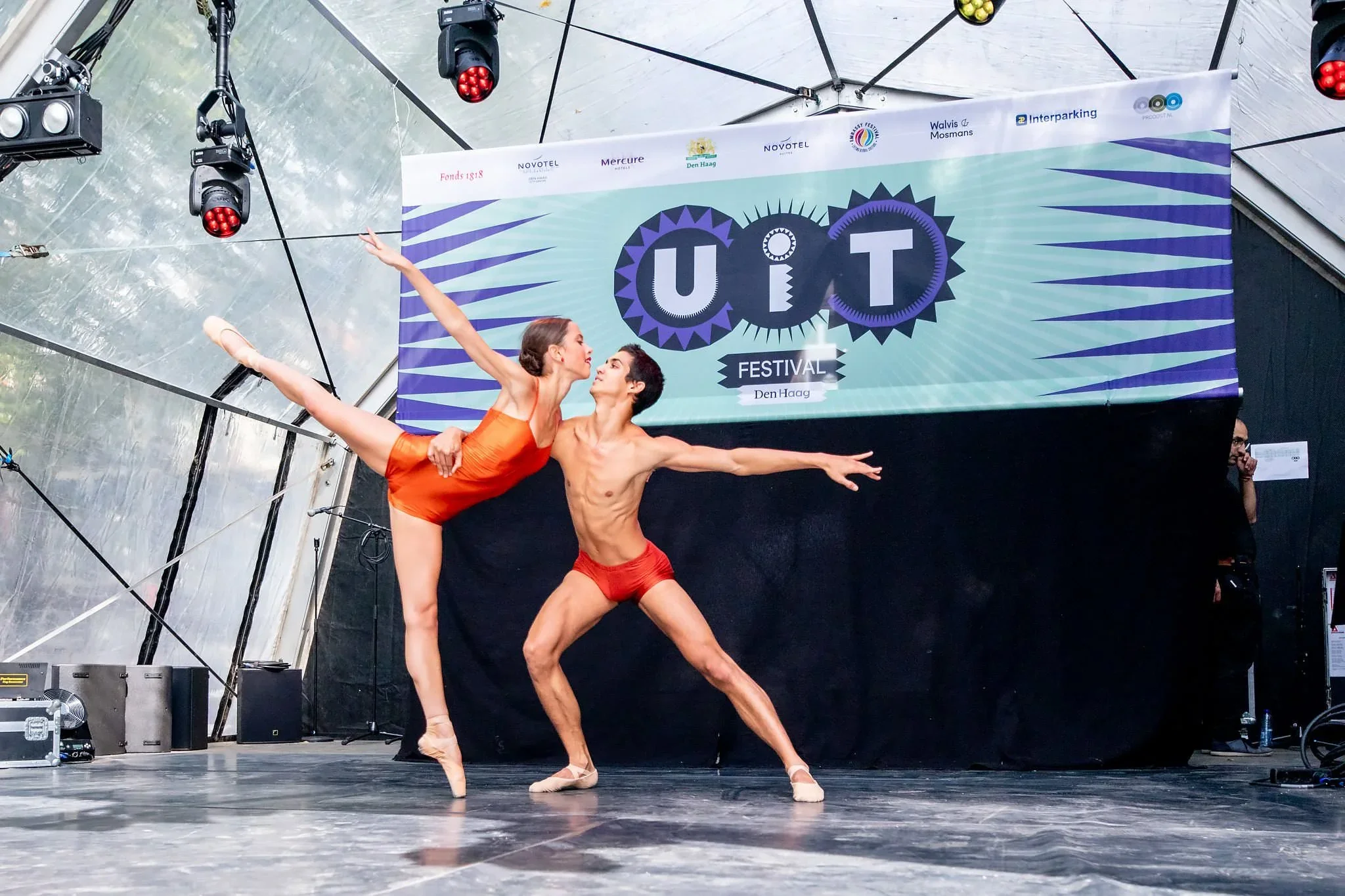 Two ballet dancers, a woman in an orange dress and a man shirtless in red shorts, perform on stage at the UIT Festival in Den Haag, with a large banner behind them.