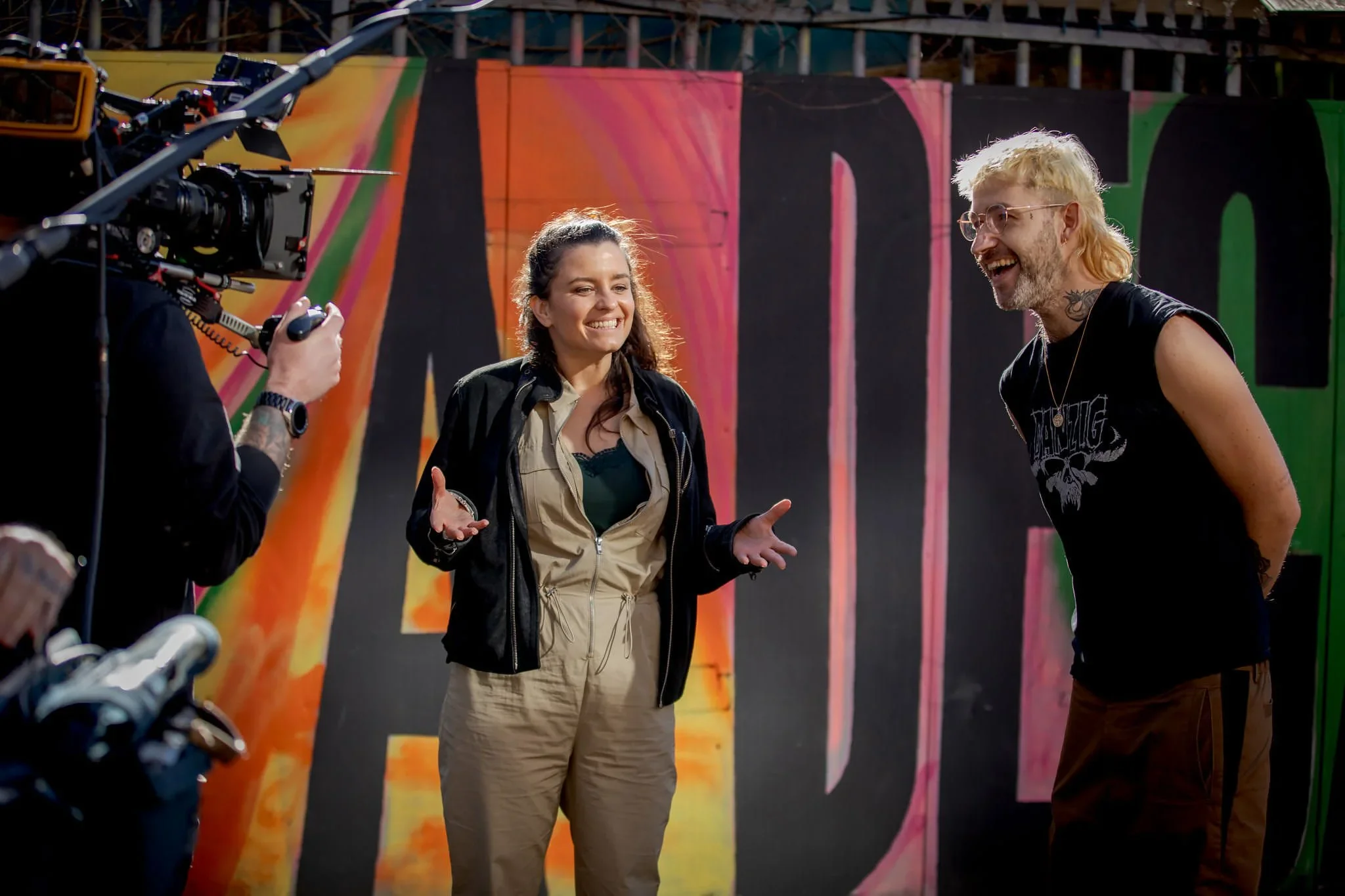 Two people are outdoors, talking and smiling as a camera films them. The woman on the left has brown curly hair, is wearing a beige jumpsuit and black jacket. The man on the right has blond hair, glasses, tattoos, and is wearing a black sleeveless sh