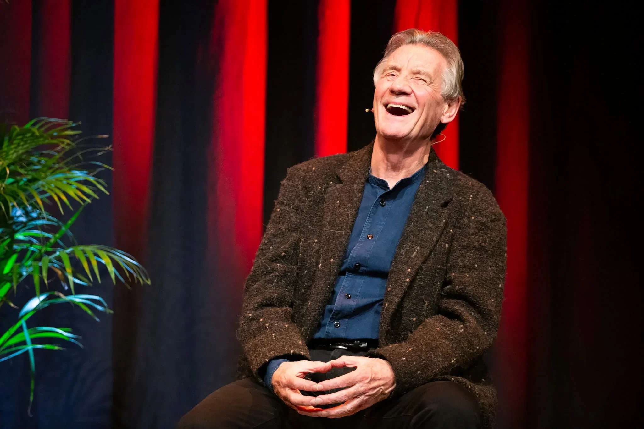 An elderly man with gray hair laughing while sitting on stage with red and black curtains in the background, wearing a brown blazer and dark blue shirt.