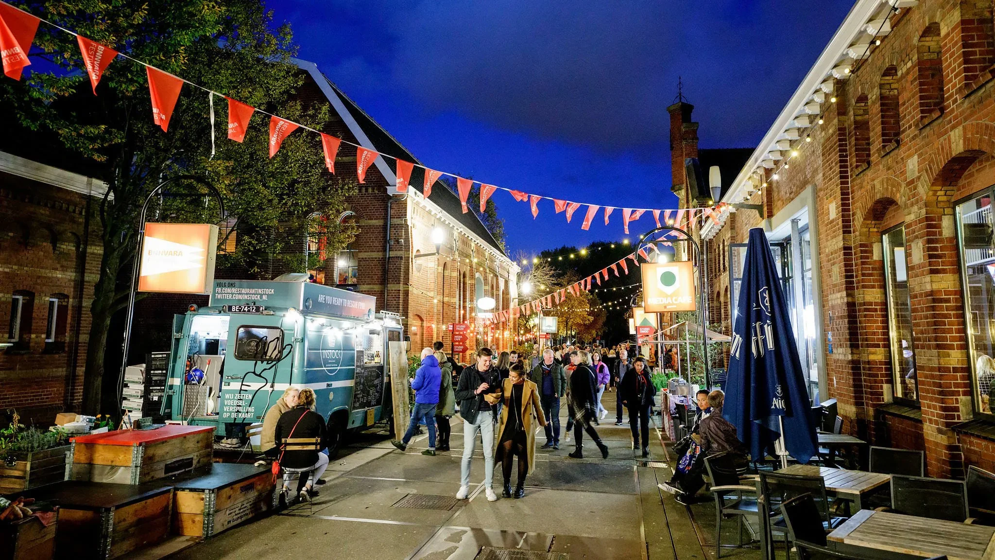 A lively street scene at night with people walking, sitting, and dining outside a brick building. festive string lights and red bunting decorate the street.