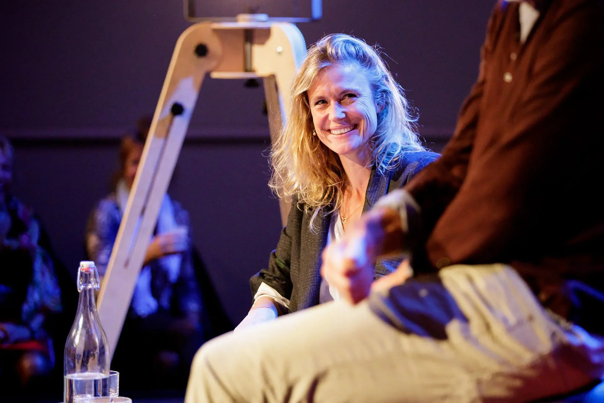 A woman with curly blonde hair smiles while engaging in a conversation with a man in a brown jacket. They are seated at a table, with a clear glass bottle of water in front of them. The background shows a dark indoor setting with other people and a w