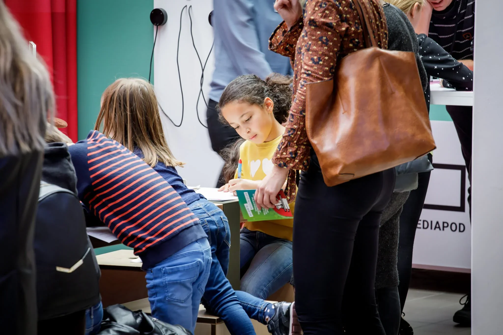 A group of people, including children and adults, gathered in a room for an event titled "Masterclass Jeugdjournaal Verslaggeving" on a large screen, with microphones and media banners present.