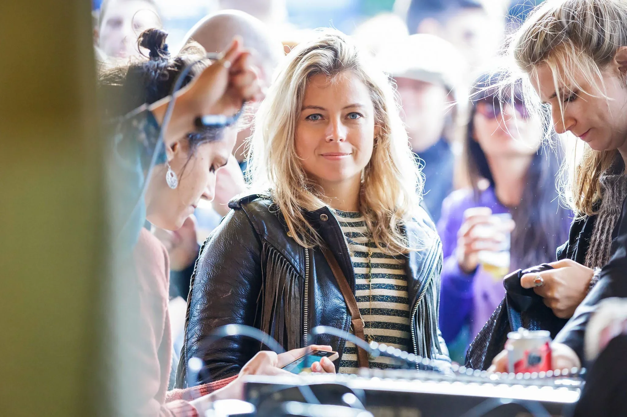 A woman with light blonde hair wearing a black leather jacket and striped shirt in a crowd of people, some of whom are holding drinks.