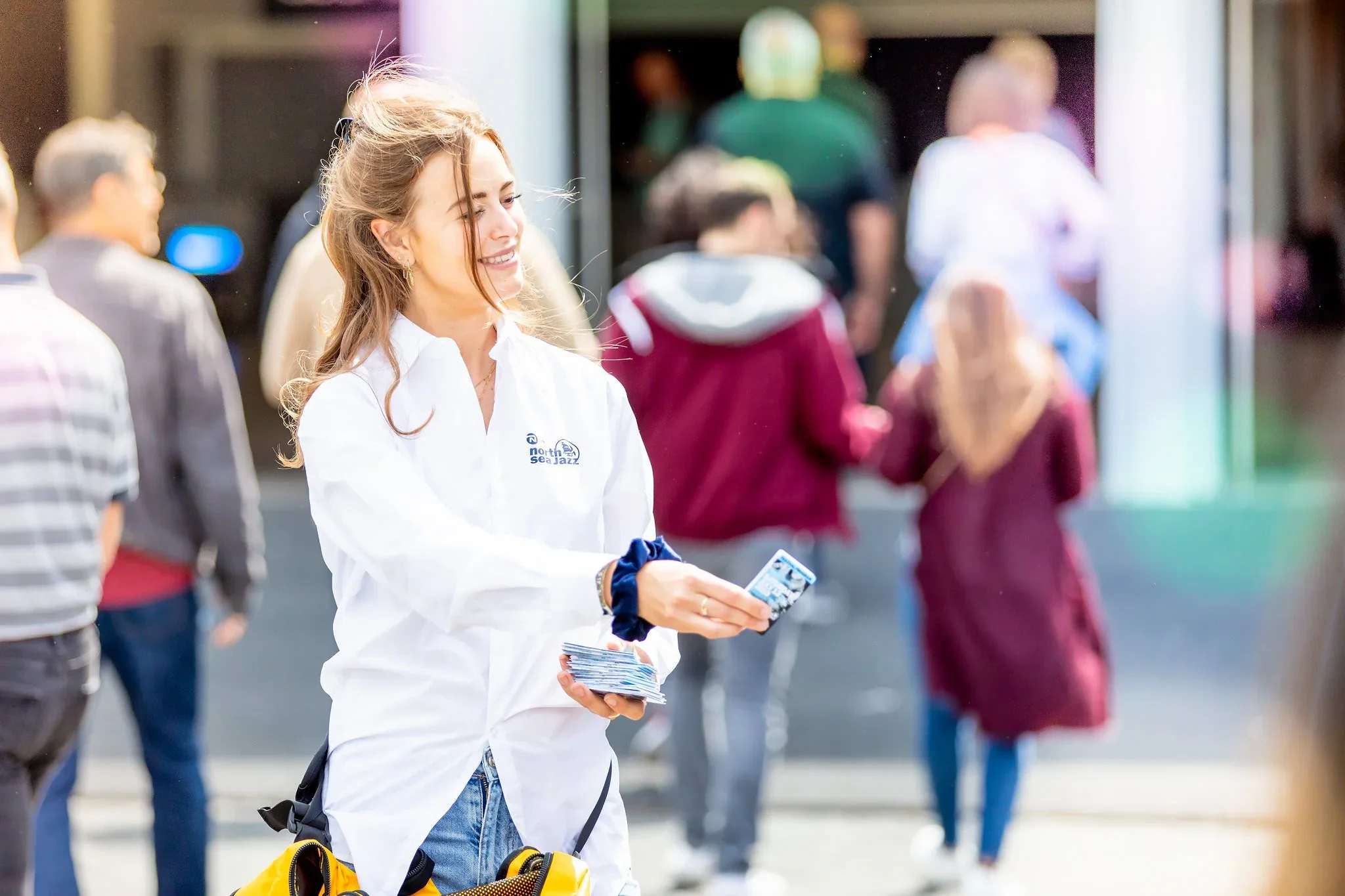 A young woman with long wavy hair smiling and holding a flyer on a busy city street. She is wearing a white shirt with a logo and has a yellow bag hanging from her shoulder.
