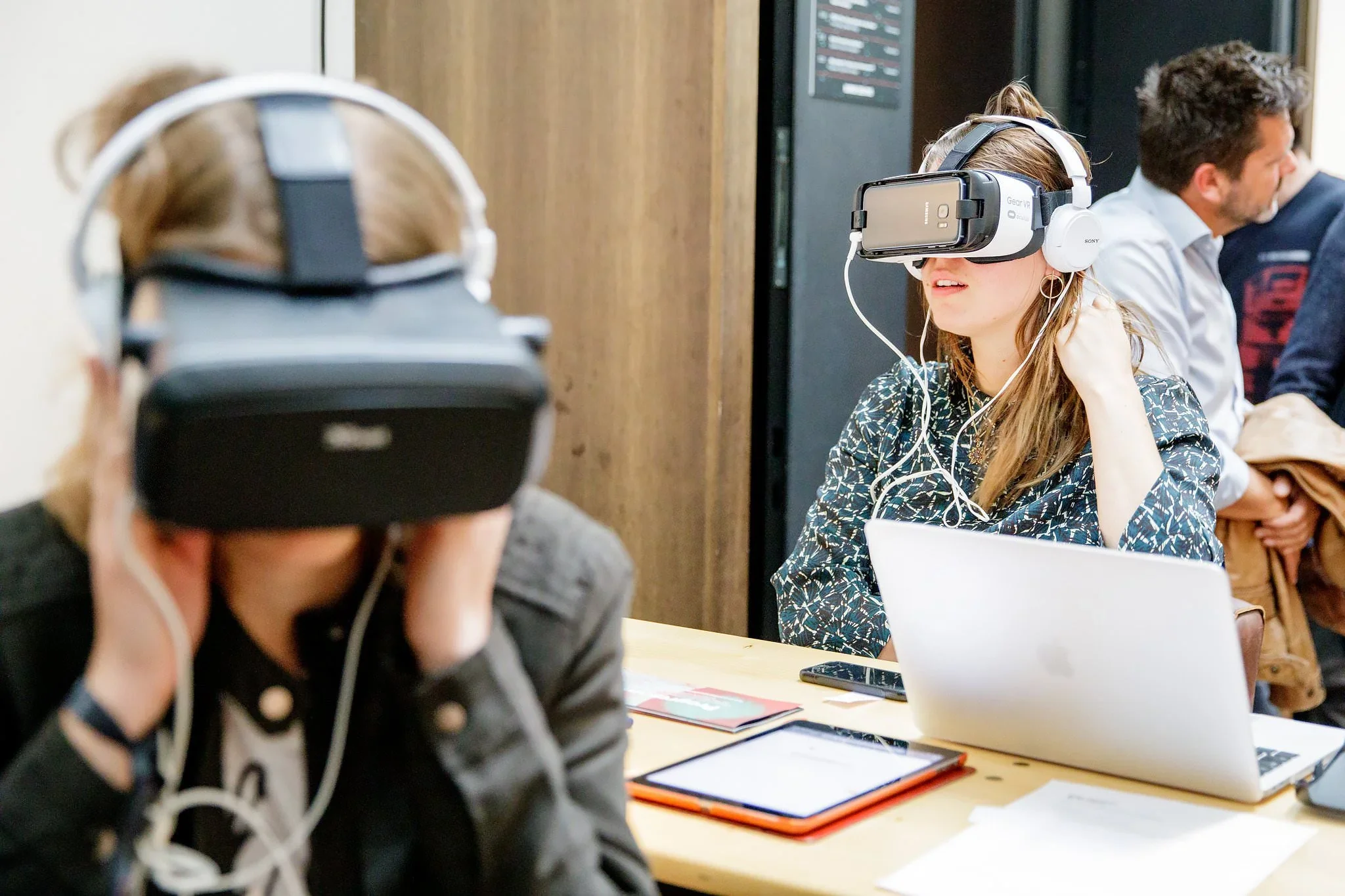 Two women wearing virtual reality headsets and headphones at a table, with laptops and tablets in front of them, in a classroom or office setting.