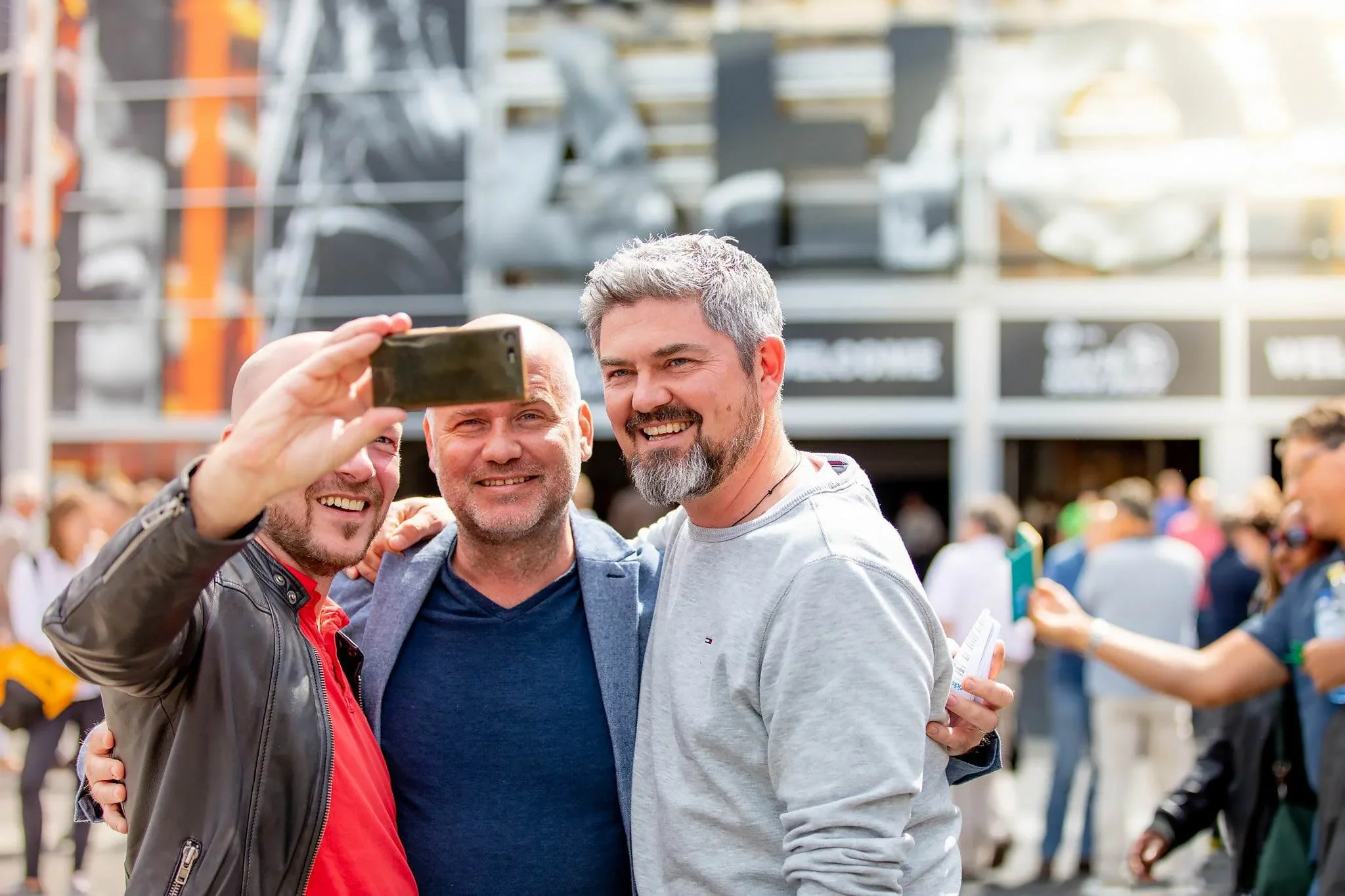 Three men are taking a selfie together at an outdoor event, smiling and embracing each other. The background shows a crowd of people and a modern building.