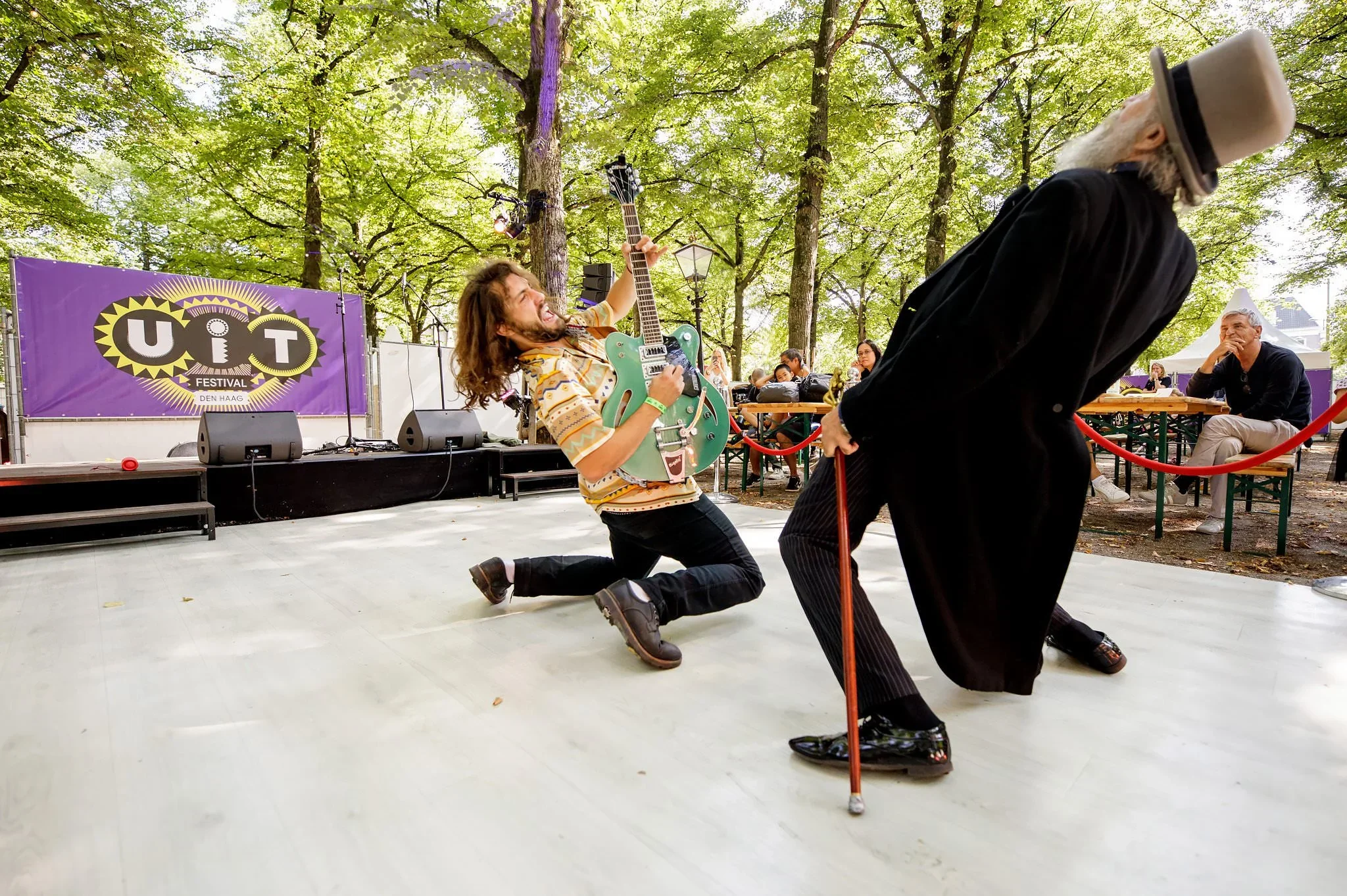 A musician with long hair playing an electric guitar on stage at an outdoor festival, leaning back with an expressive face, while another person with a white beard, top hat, black coat, and walking cane dances in front. Audience members are sitting a
