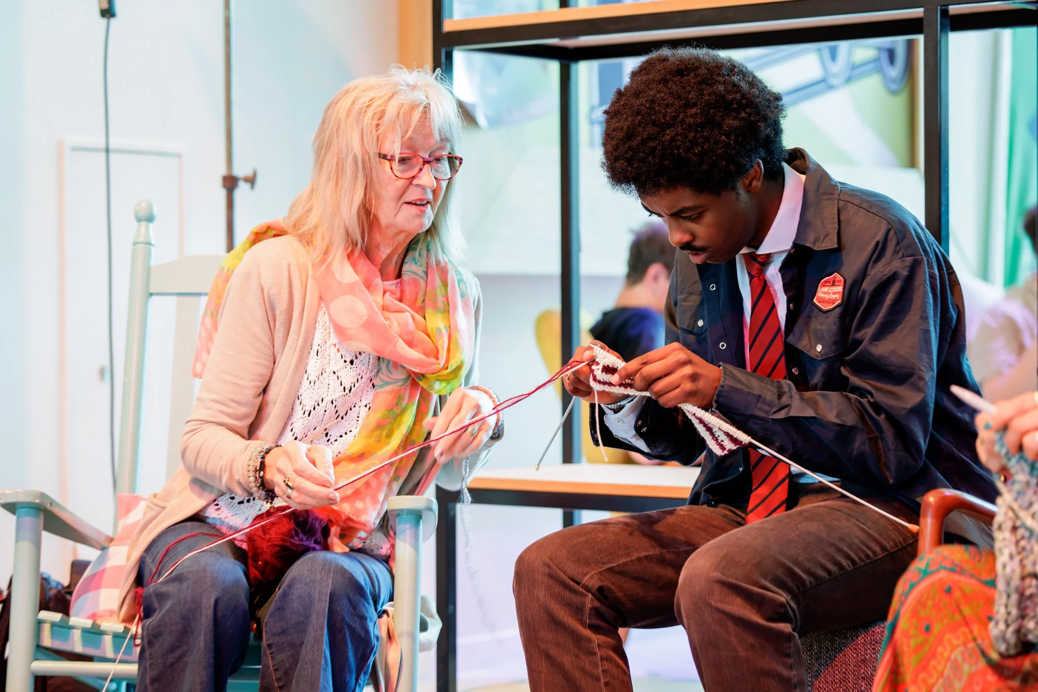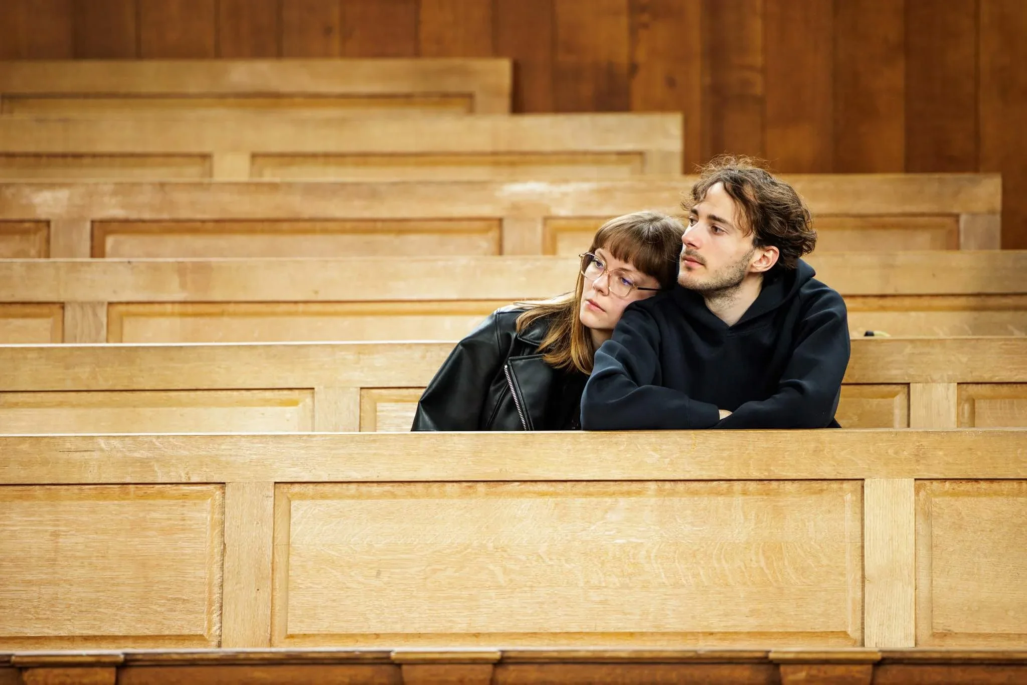 A young woman with glasses and a young man sit together in wooden courtroom benches, looking contemplative.