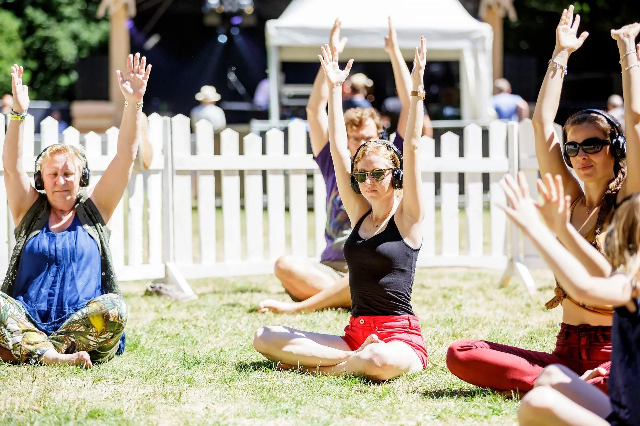 People sitting cross-legged on grass with headphones, raising their hands, participating in an outdoor event on a sunny day, with a white fence and stage in the background.