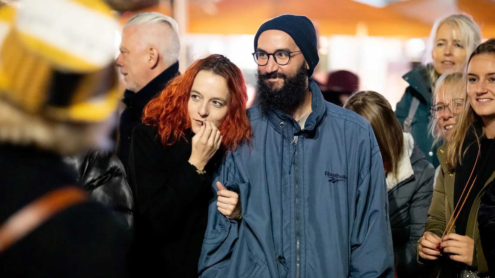 A group of people at an outdoor gathering, including a woman with red curly hair and a man with glasses and a black beanie, smiling and chatting.