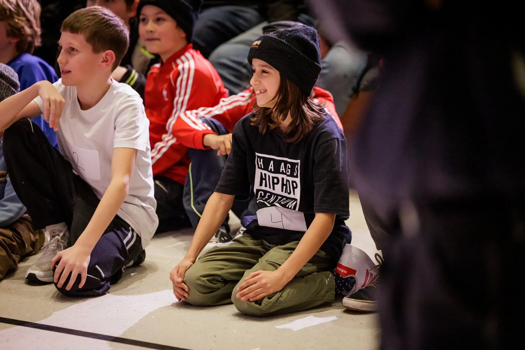 Children sitting on the floor, smiling and engaging, in a group setting.