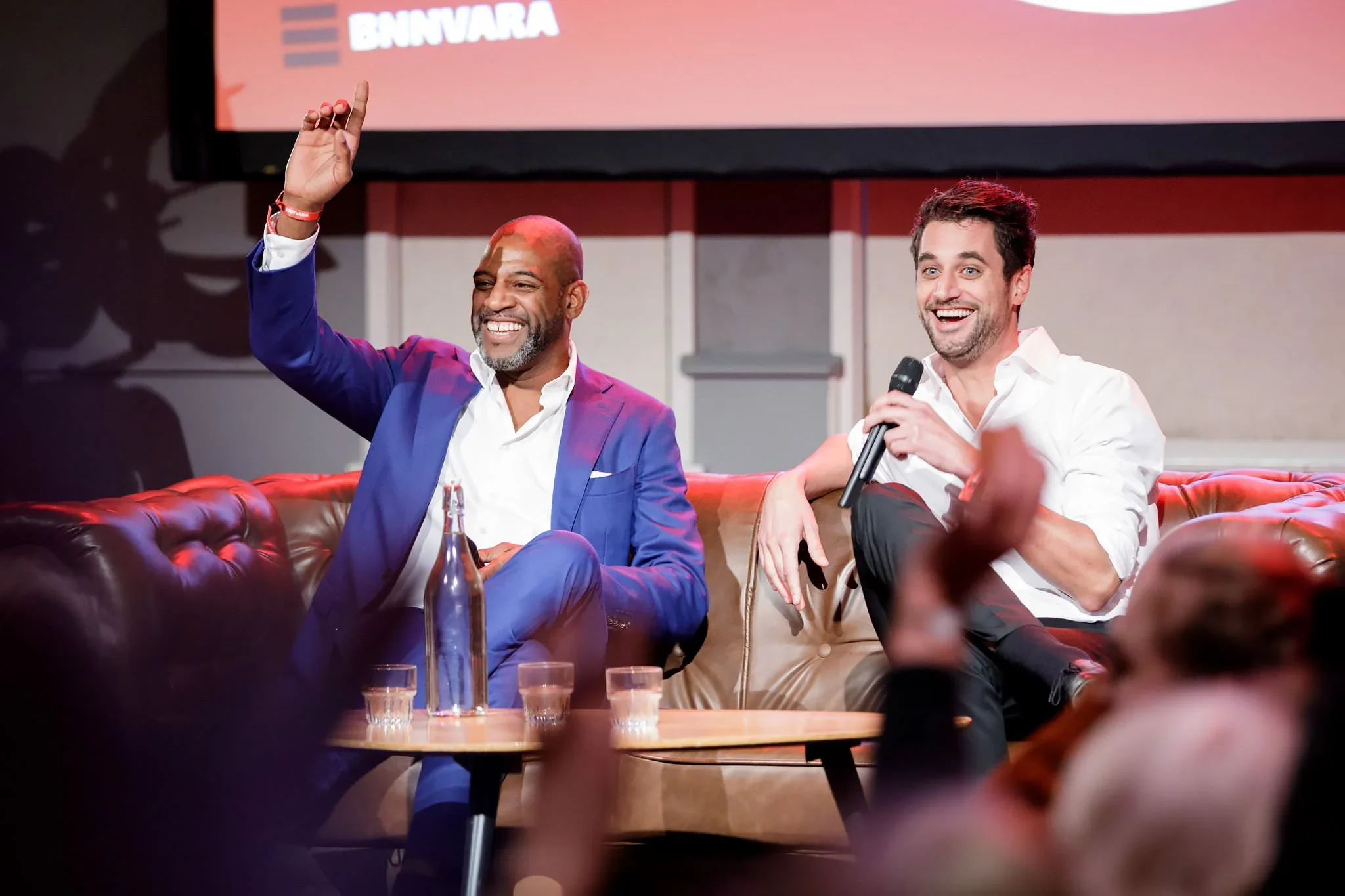 Two men sitting on a leather couch, smiling and engaging with an audience during a talk or interview. One man is speaking into a microphone, while the other is raising his hand. There are two glasses on the table and a large screen with the text 'BIN