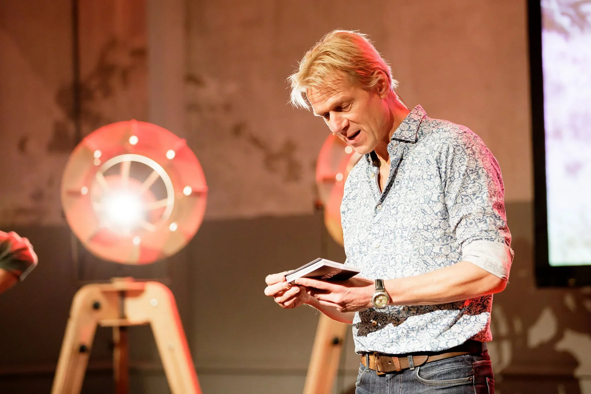 Man with blond hair wearing a patterned shirt and watch, reading from a small booklet in a room with stage lighting.