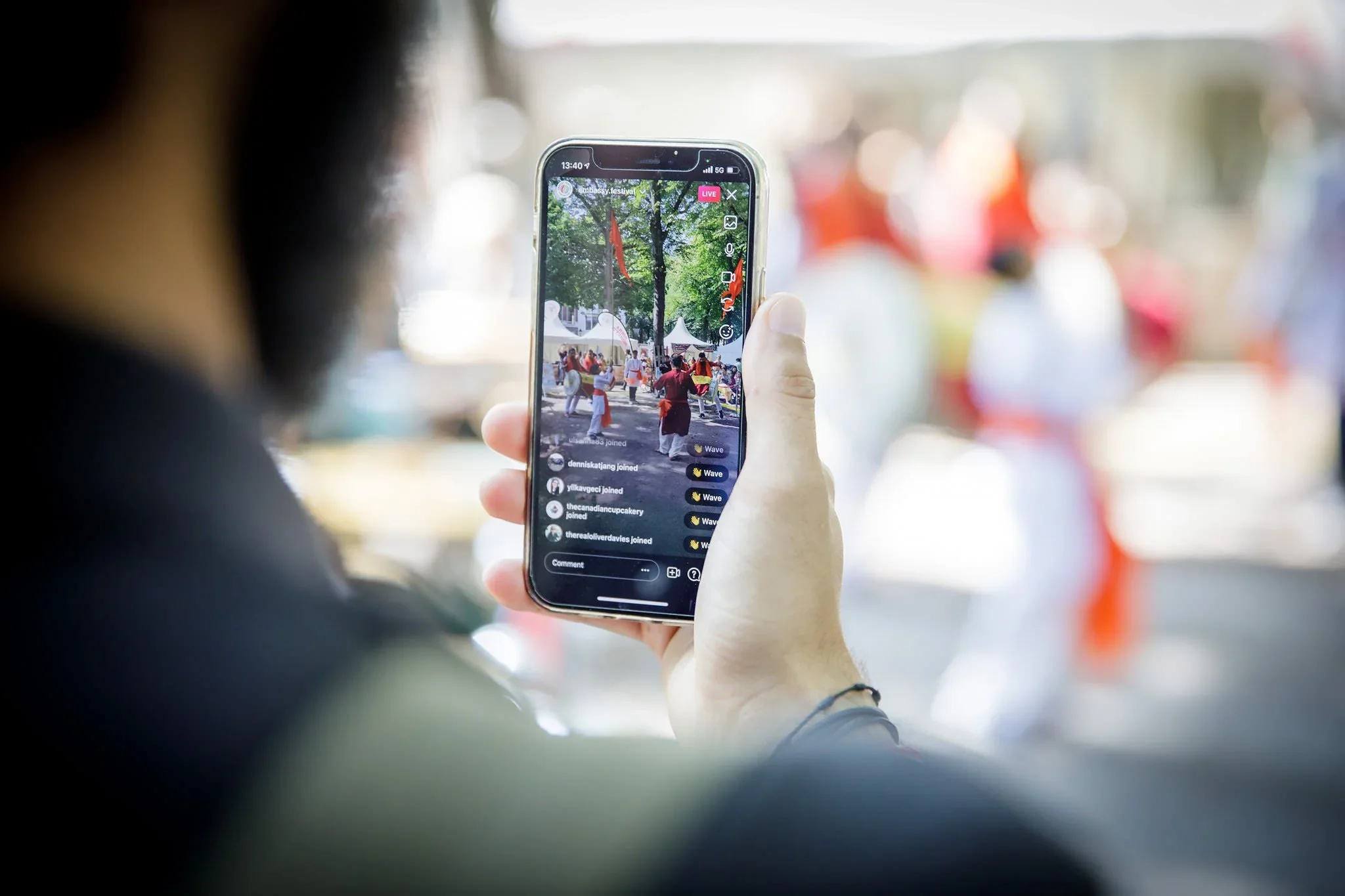 Person taking a photo of a festival scene on a smartphone, with trees and festival tents in the background.