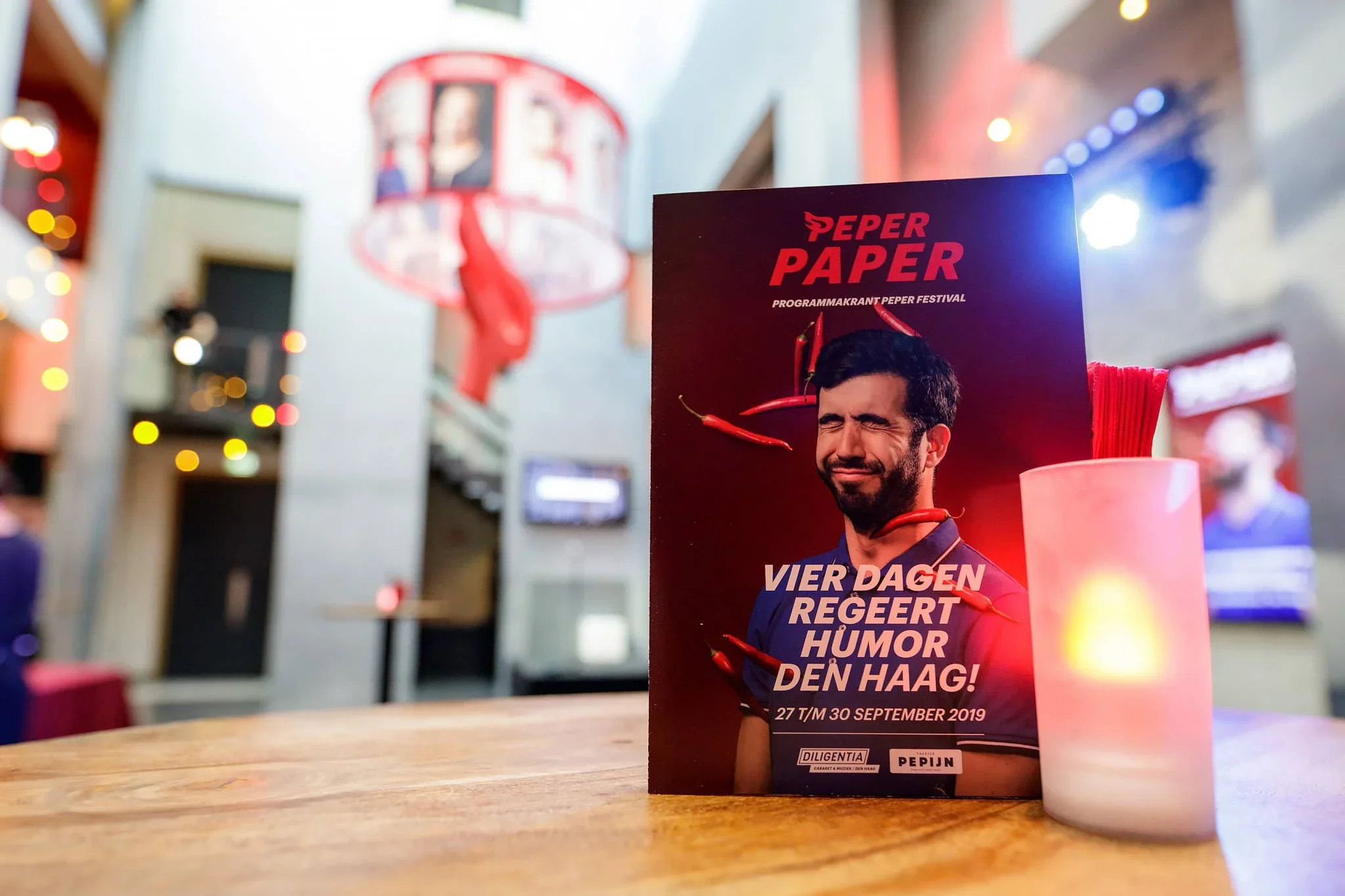A promotional poster for Peper Paper festival with a humorous man on it, placed on a wooden table. The background shows a lively venue with blurred lights and decorations.