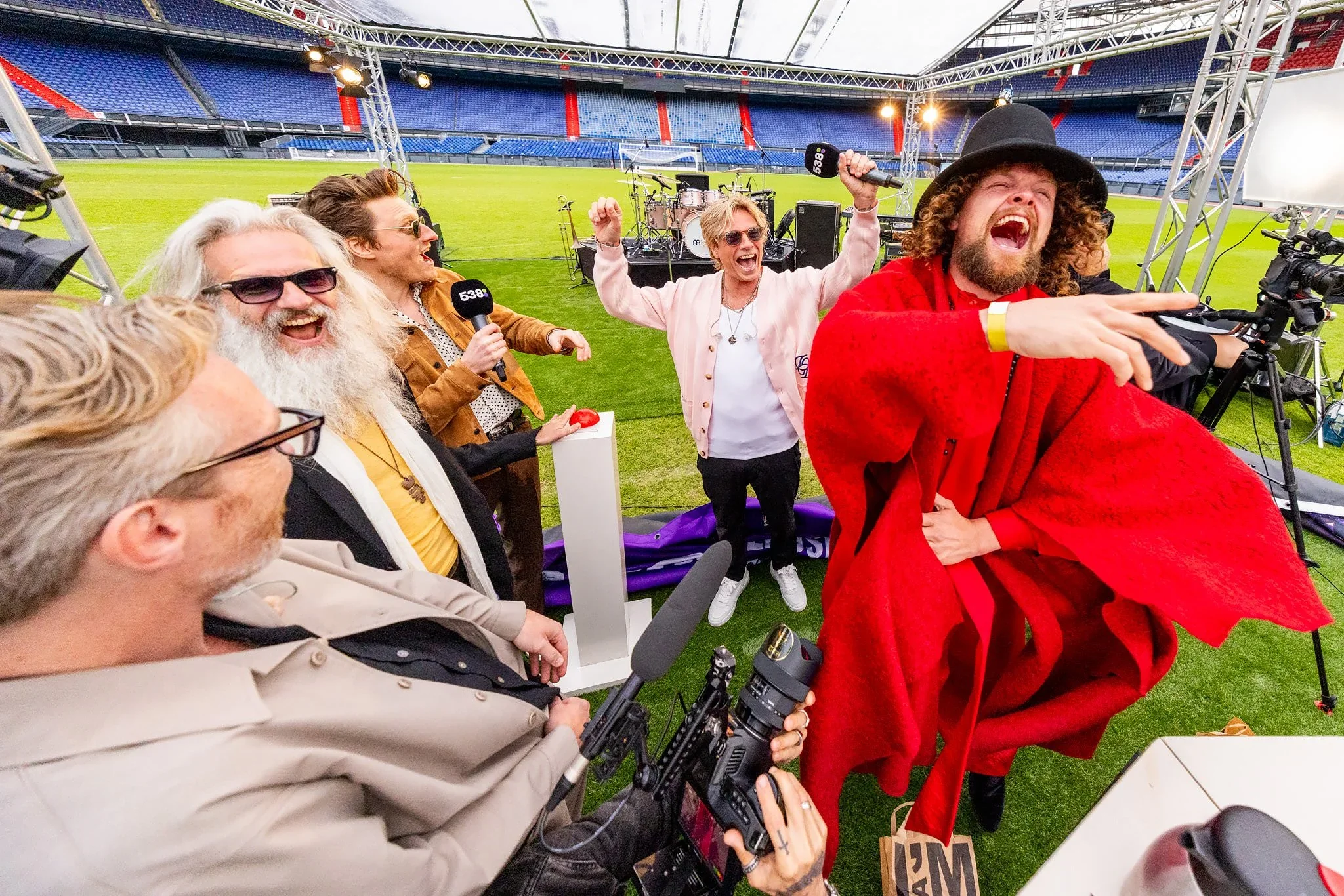 A lively group of people on a stage inside a sports stadium with a musical band setup in the background. The group appears to be celebrating or performing, with one individual in a prominent red gown and hat, holding a microphone, while others are la