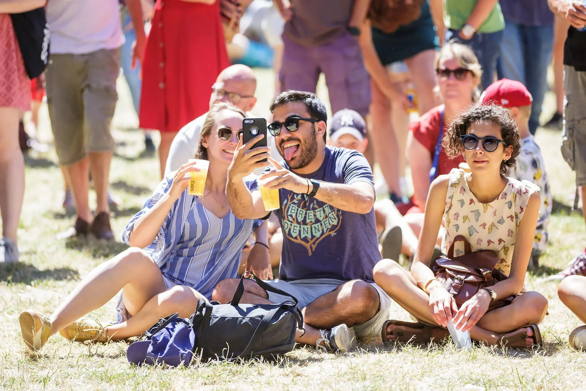 Group of people sitting on grass, taking selfies, and holding drinks at an outdoor event.