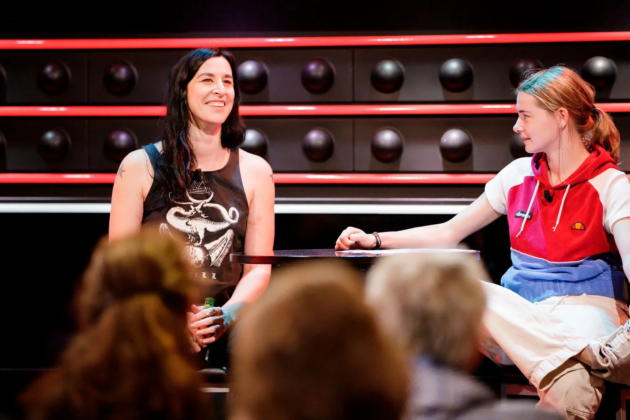 Two women engaging in conversation during a public event, with an audience present. The woman on the left has long dark hair, wearing a sleeveless top with a dragon print, smiling. The woman on the right has long light brown hair tied back, wearing a