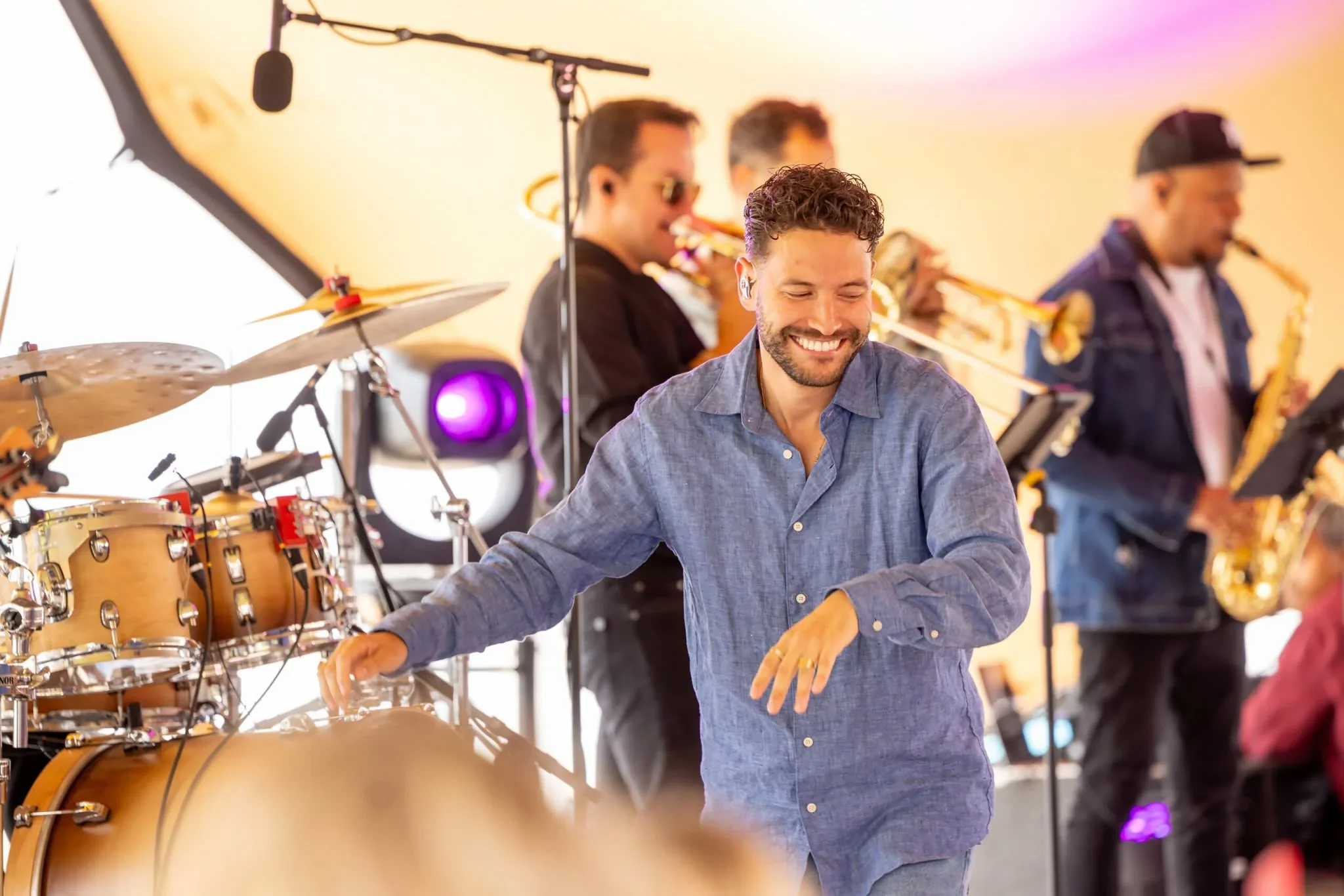 Man dancing at a live music performance with a band playing behind him, including a drummer, saxophonist, and trumpet player.