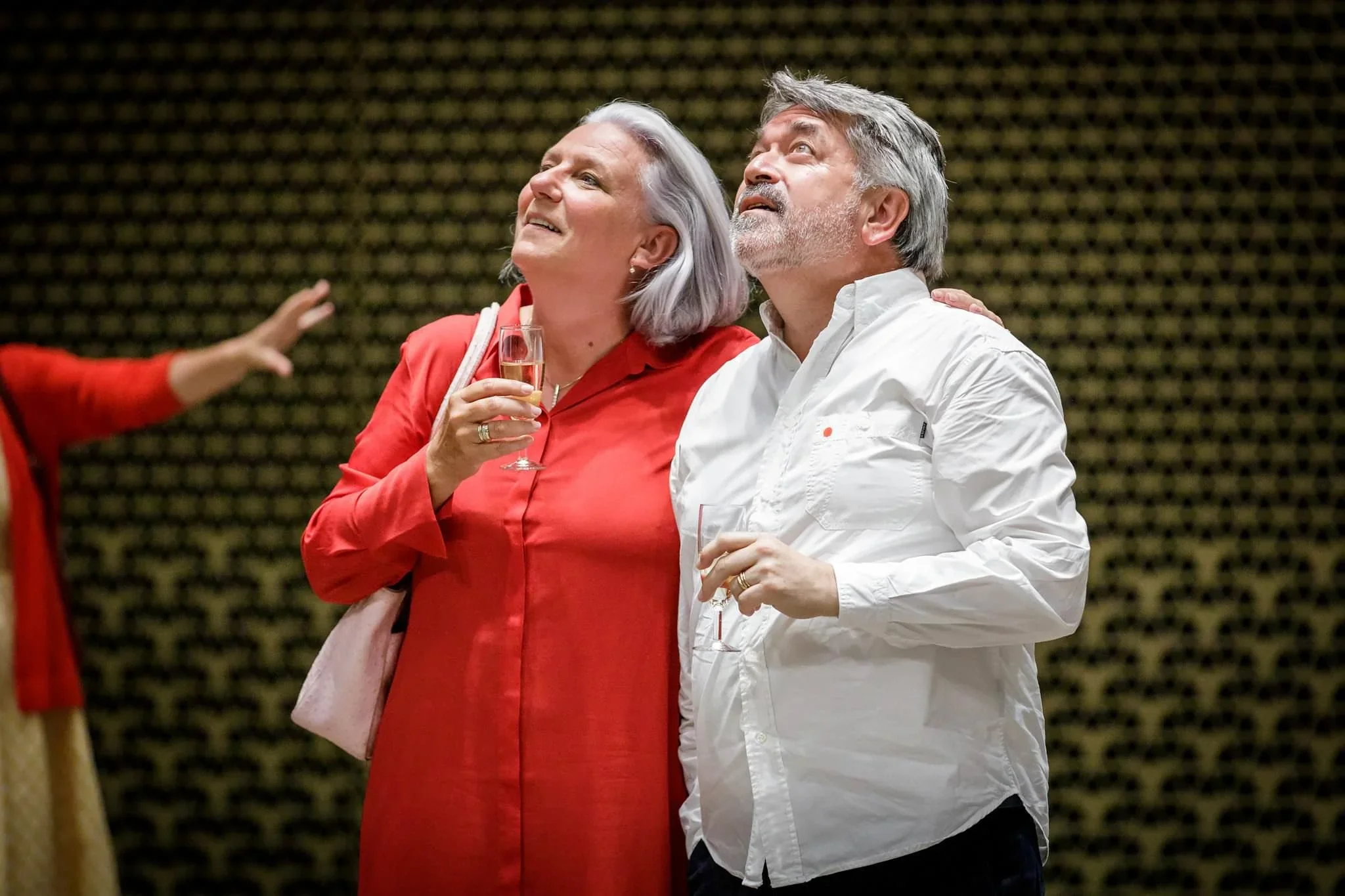 An older woman and man with gray hair, standing together at a social event, holding champagne glasses and looking upwards with expressions of admiration or awe.