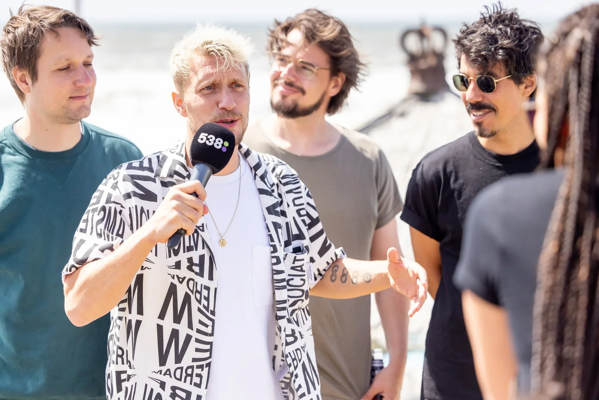 A group of five men on a beach, one of whom is speaking into a microphone labeled 538.4, while the others listen.