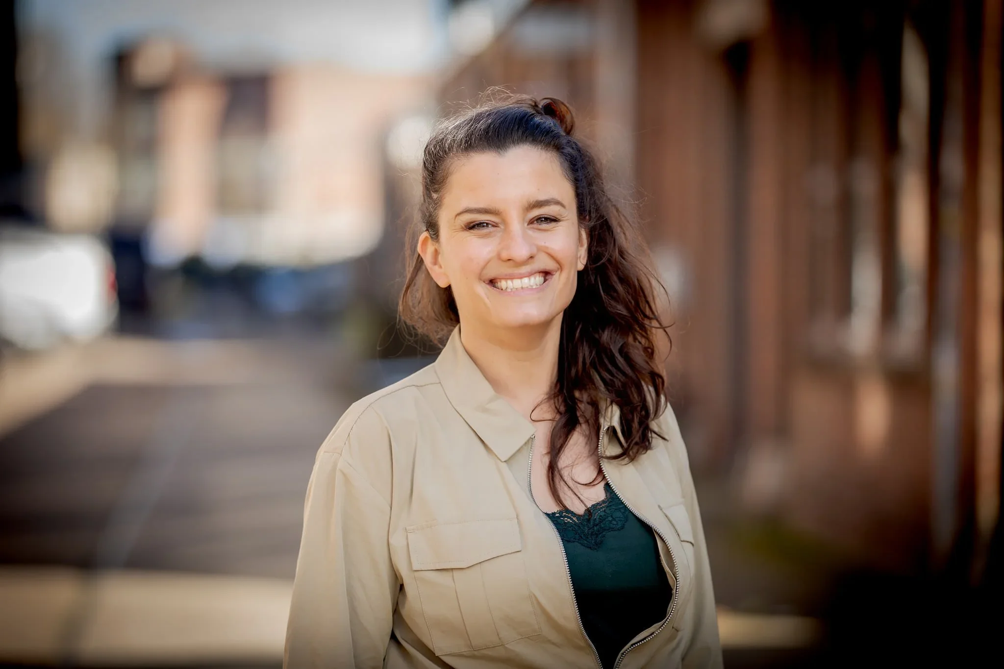 A smiling woman with long, dark, wavy hair tied back, wearing a beige jacket over a dark top, standing outdoors on a street with blurred background of buildings and cars.