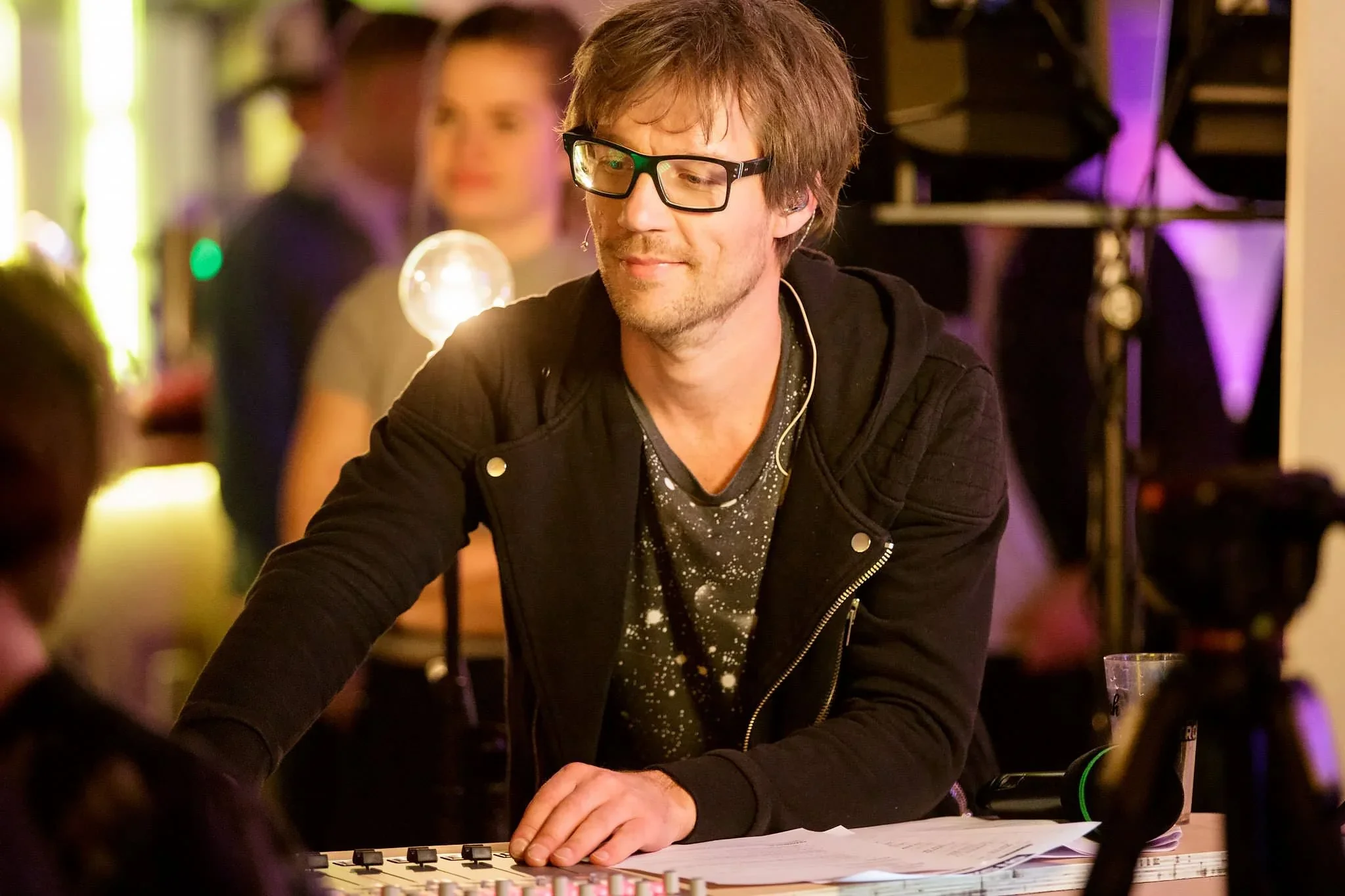 A man with glasses wearing a black jacket and galaxy-themed shirt, working with audio equipment on a table in a colorful, nightlife setting with blurred people in the background.
