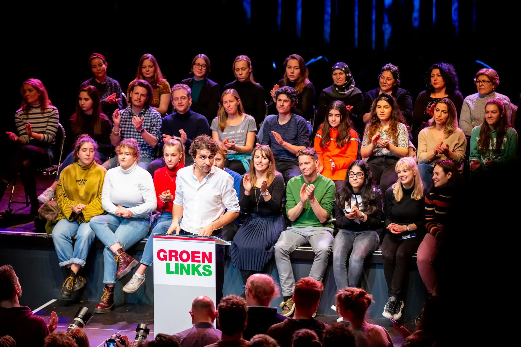 A large group of diverse people sitting on a stage and in the audience, with some clapping, during a political event organized by GroenLinks, a green political party.