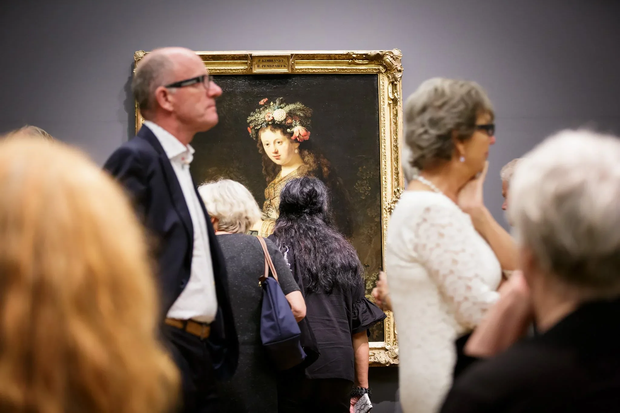 People viewing a portrait of a young girl with a floral headdress in an art gallery.