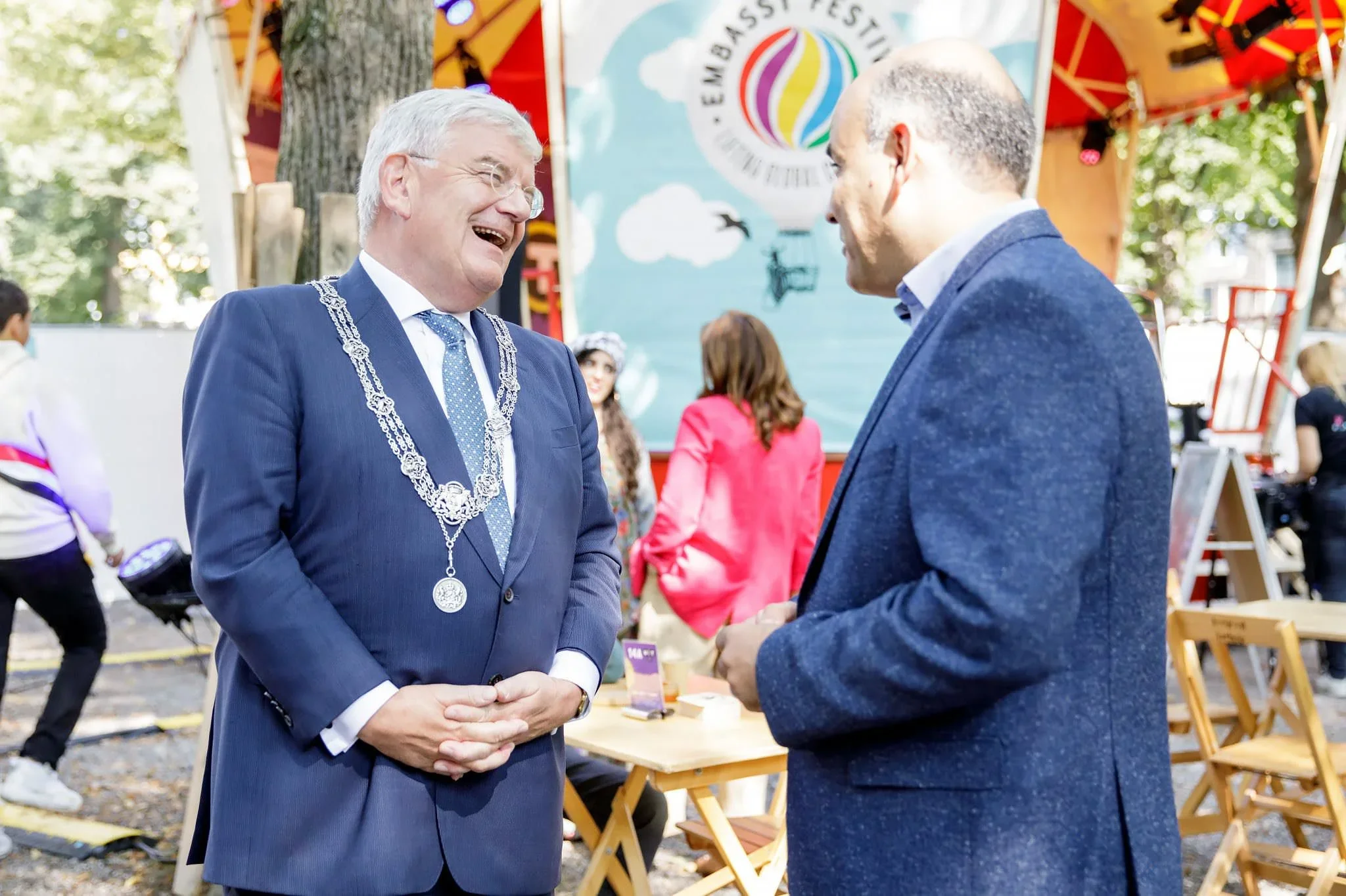 Two men in suits are talking and smiling at an outdoor festival with tents and banners in the background.
