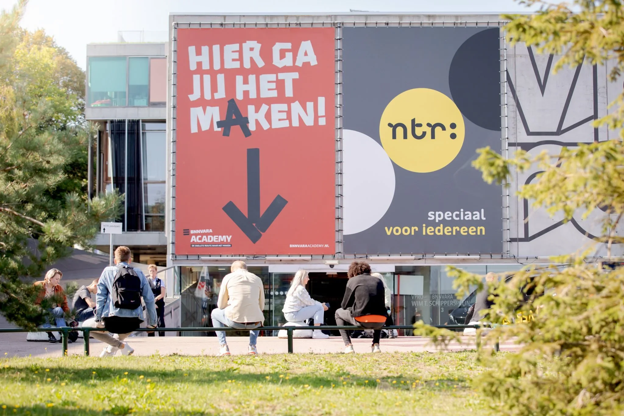 Large billboard advertising NTR with colorful geometric design and Dutch text, surrounded by trees and people sitting on a ledge in an urban area.