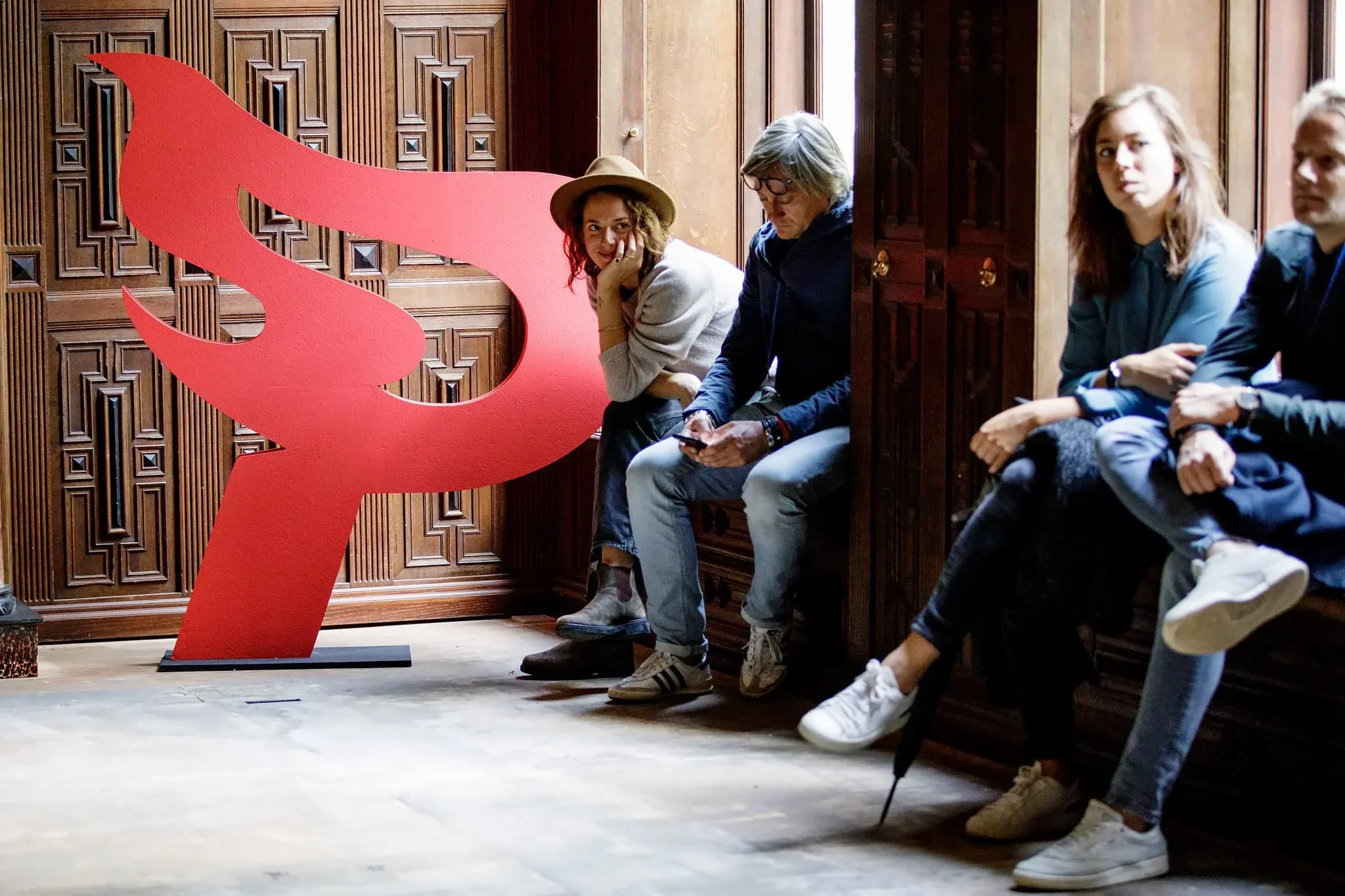 Group of four people sitting on a wooden bench in a room with wood-paneled walls, next to a large red stylized ampersand symbol.