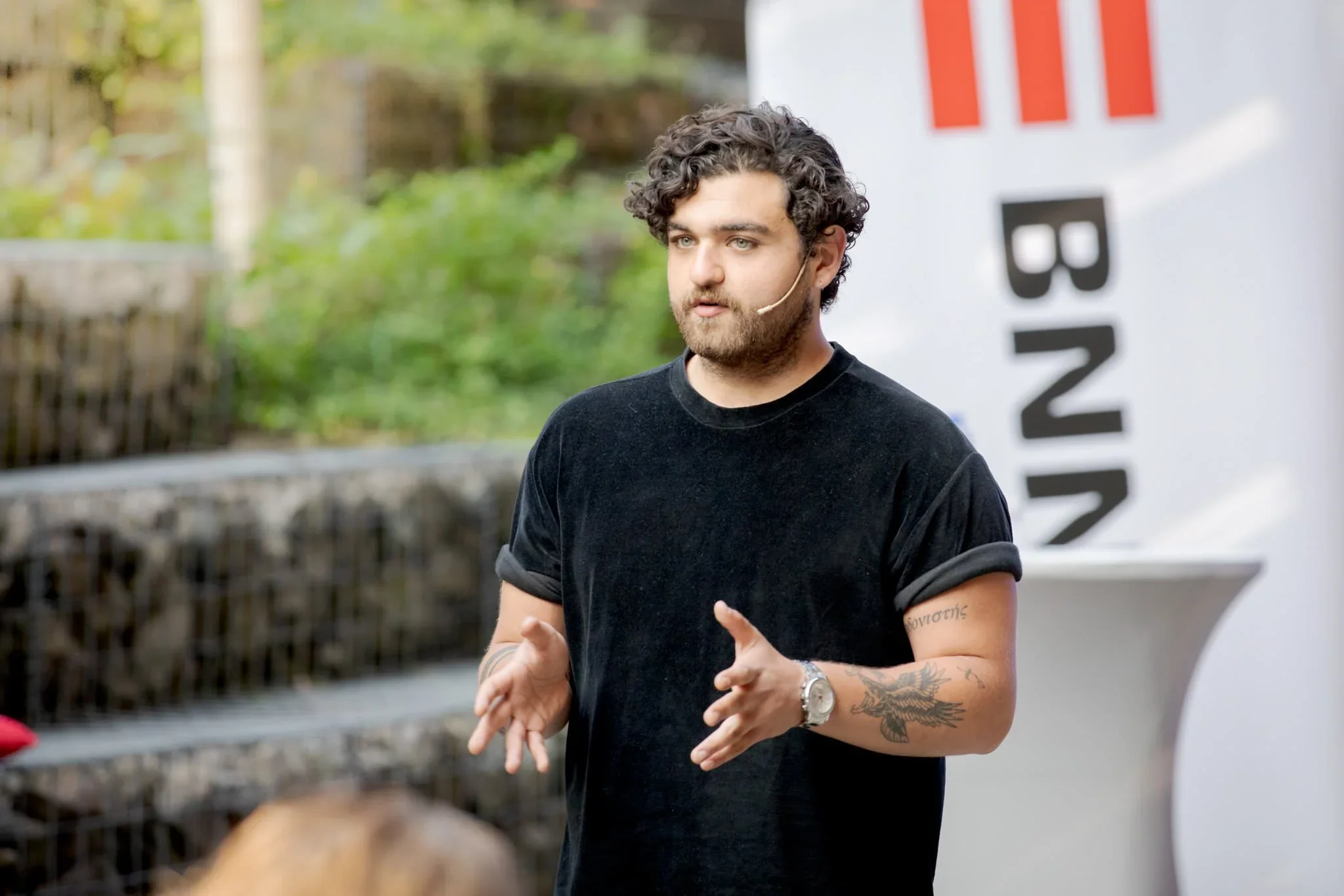 A young man with curly hair and a beard, wearing a black T-shirt, is speaking and gesturing with his hands during a presentation outdoors, with a banner in the background.