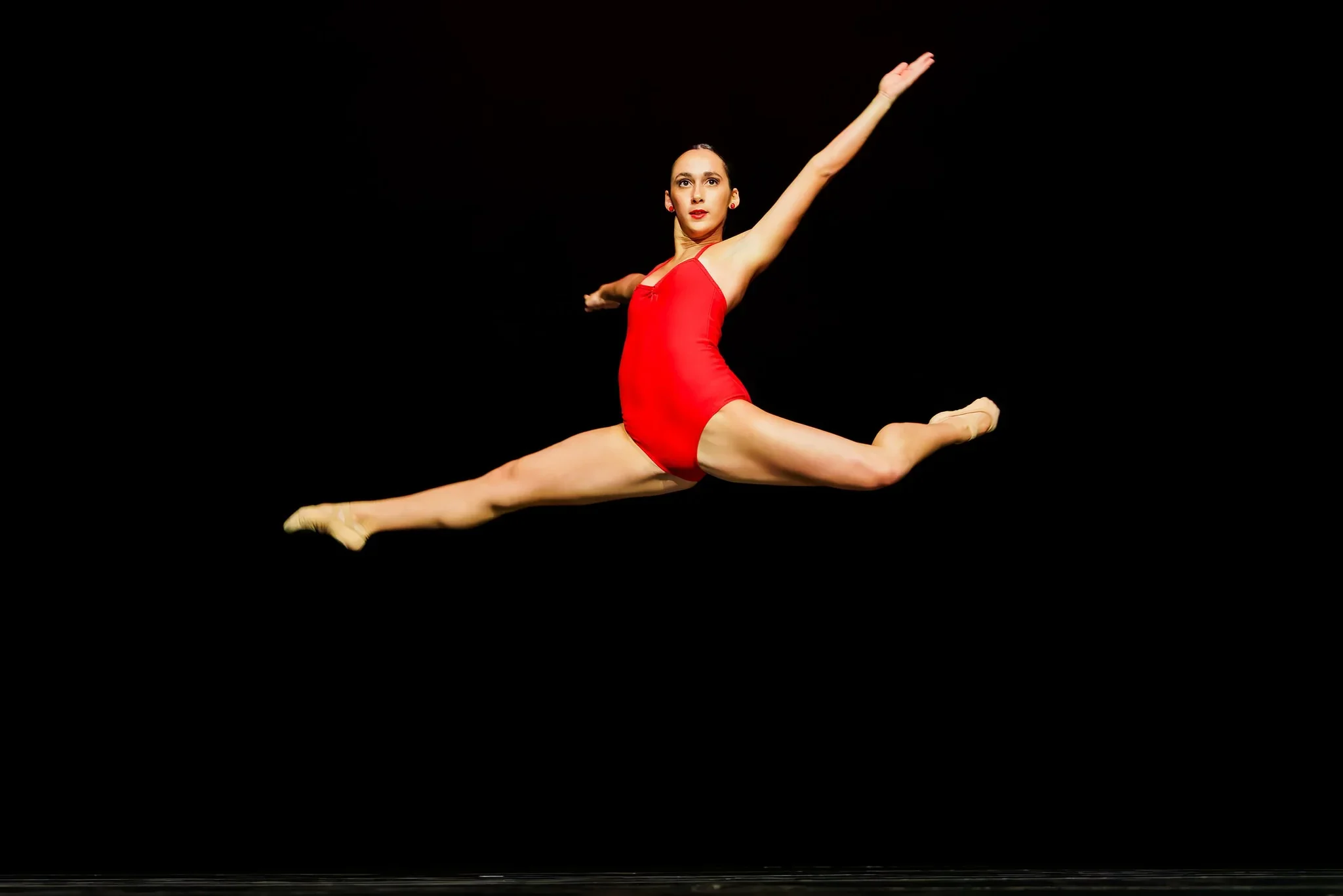A female gymnast in a red leotard performing a split jump on a stage with a black background.