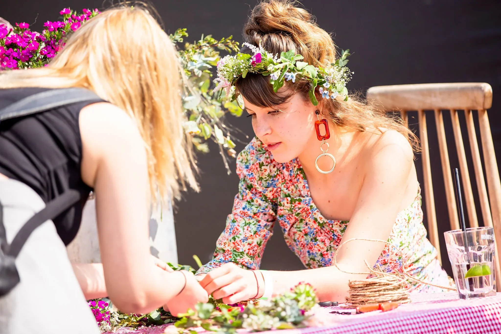 Woman with floral crown and colorful earrings leaning over a table, engaging in a craft or activity with another person, outdoor setting with flowers and a glass of water on the table.