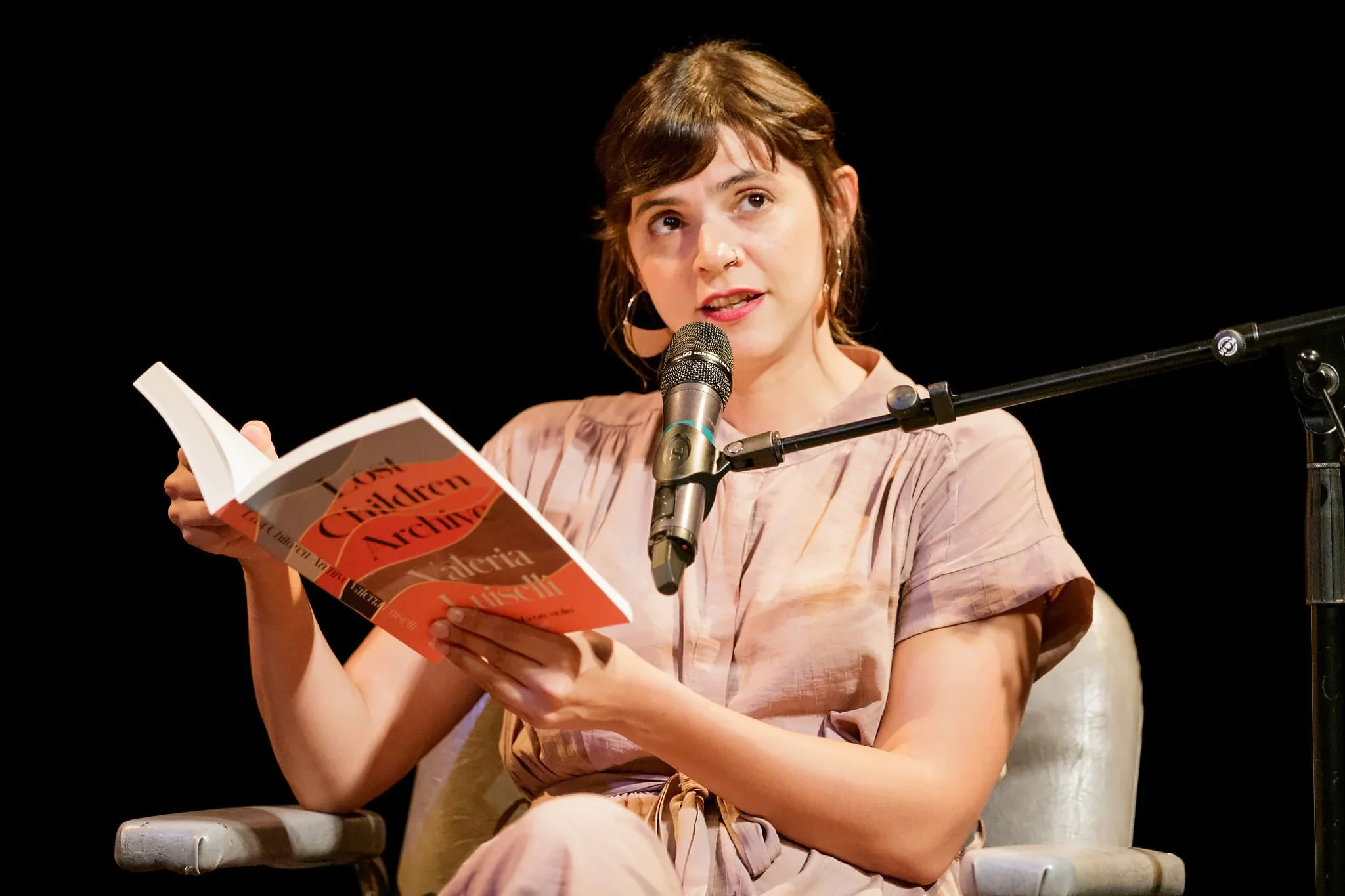 A woman sitting on a chair, holding a book and speaking into a microphone with a black background.