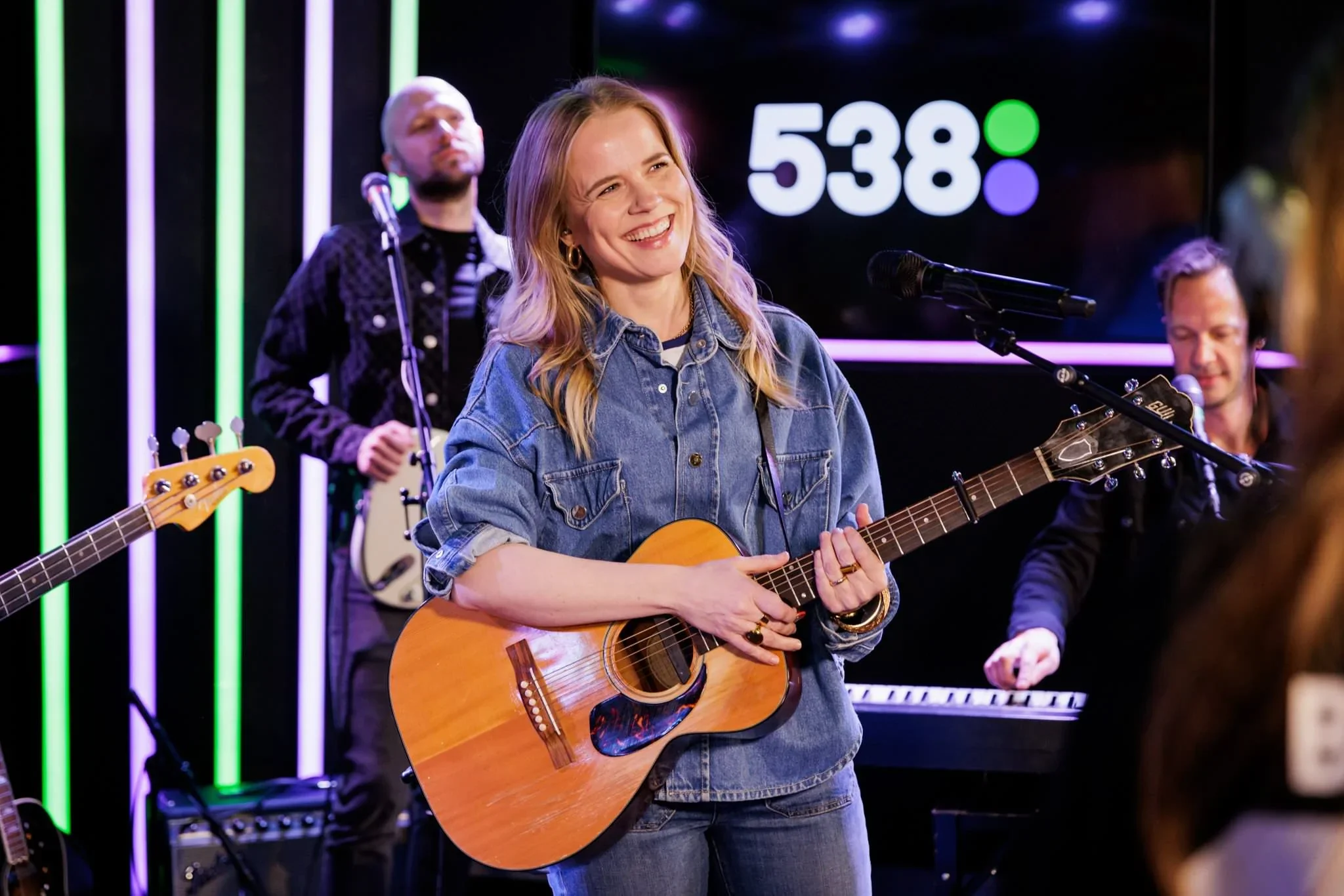 A woman playing an acoustic guitar and smiling during a live music performance with a band in the background at an indoor venue, featuring colorful neon lights.